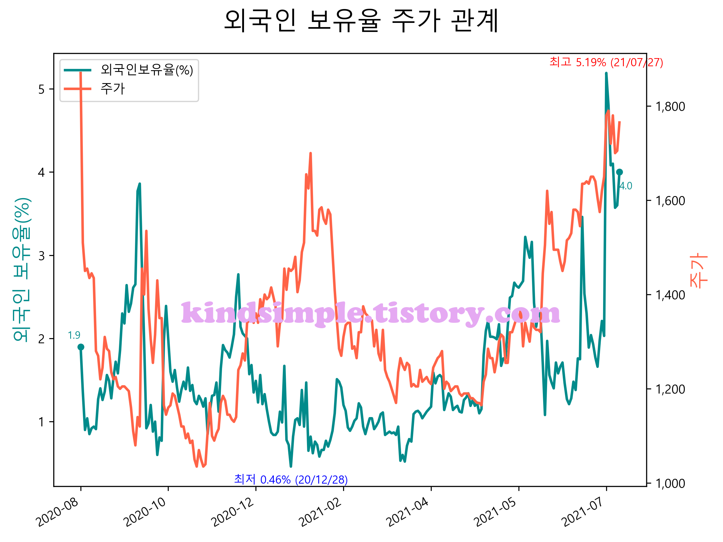 최근 1년간 외국인 보유율 및 주가와의 관계입니다.