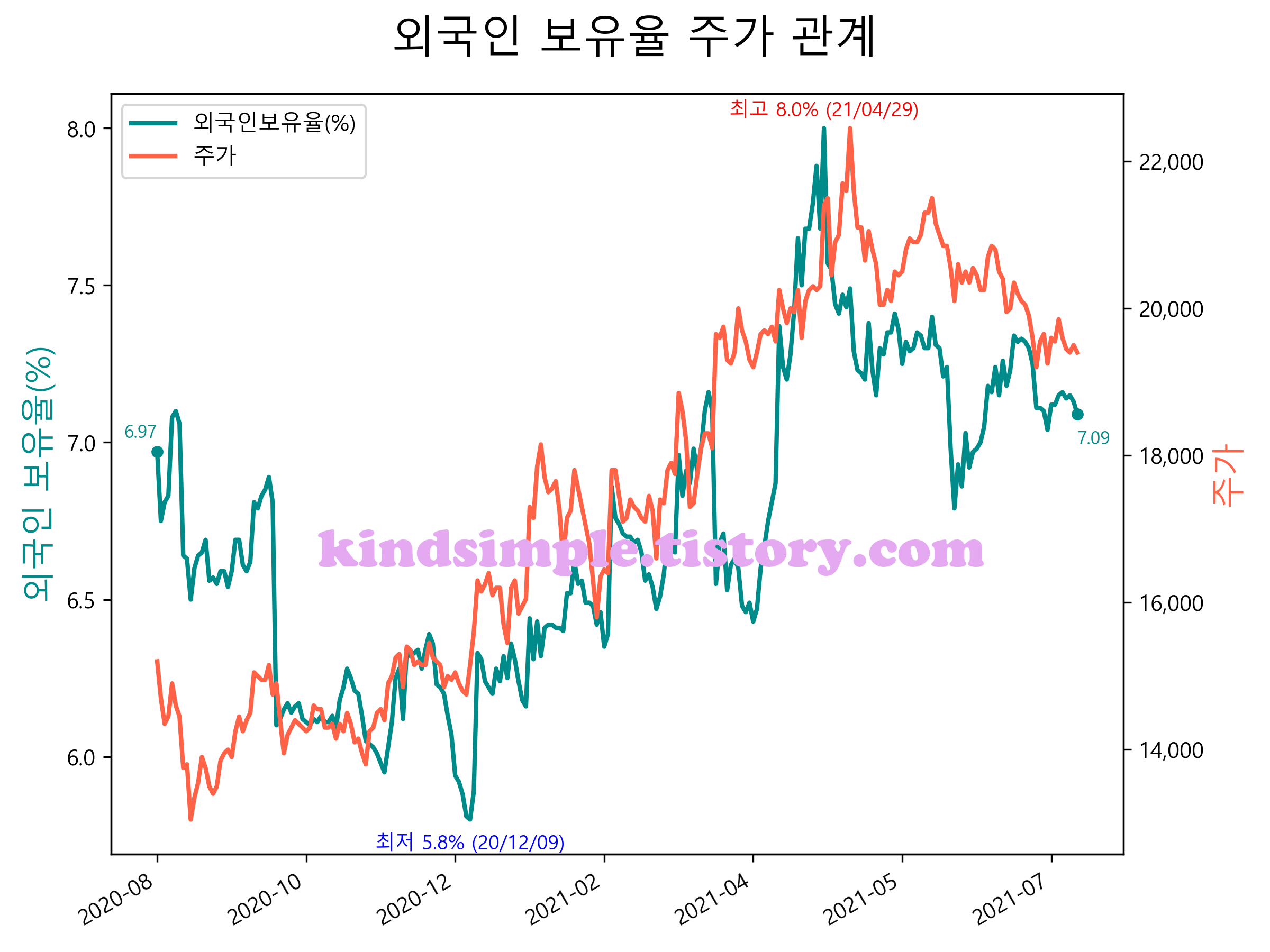 최근 1년간 외국인 보유율 및 주가와의 관계입니다.