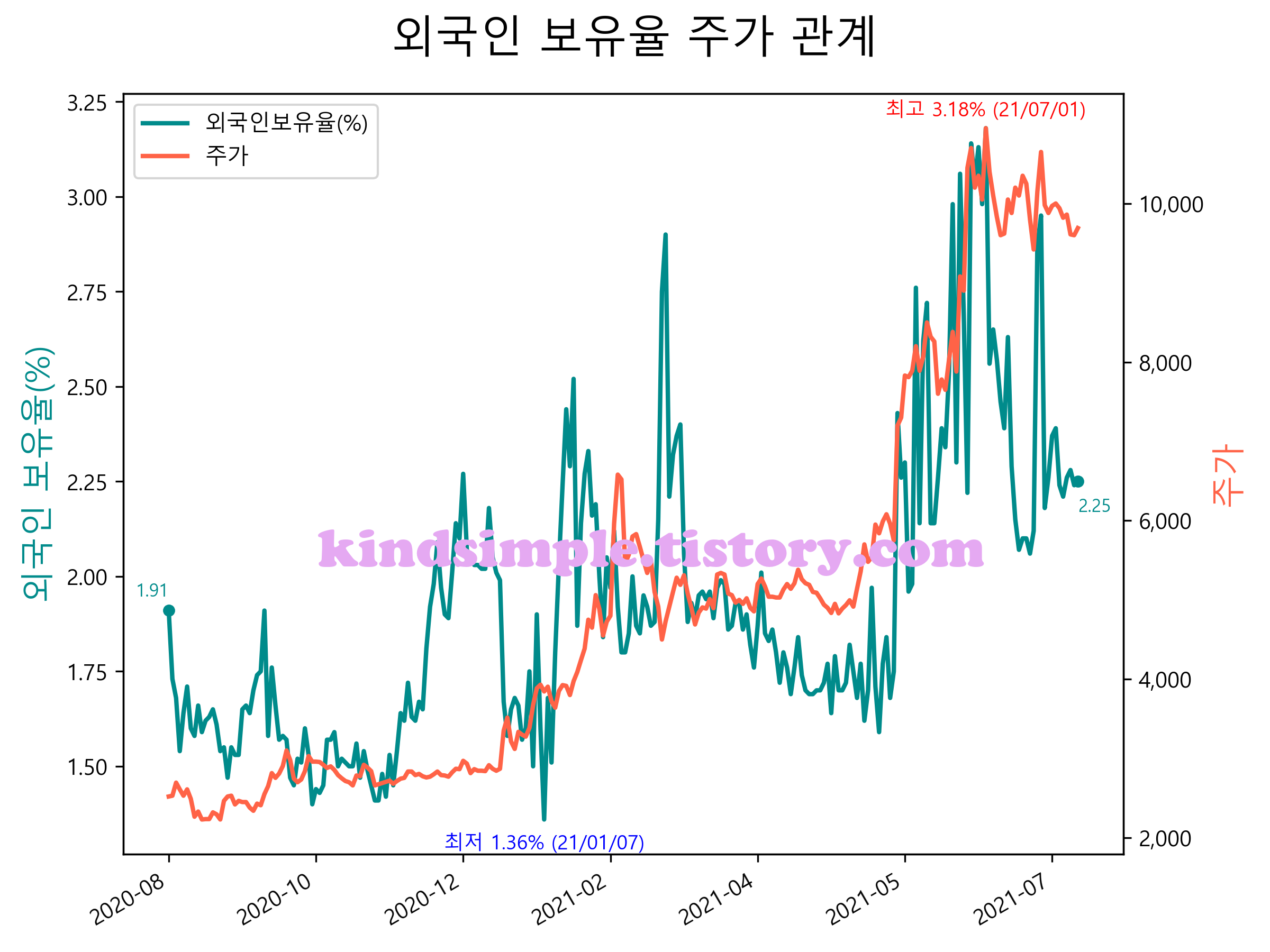 최근 1년간 외국인 보유율 및 주가와의 관계입니다.