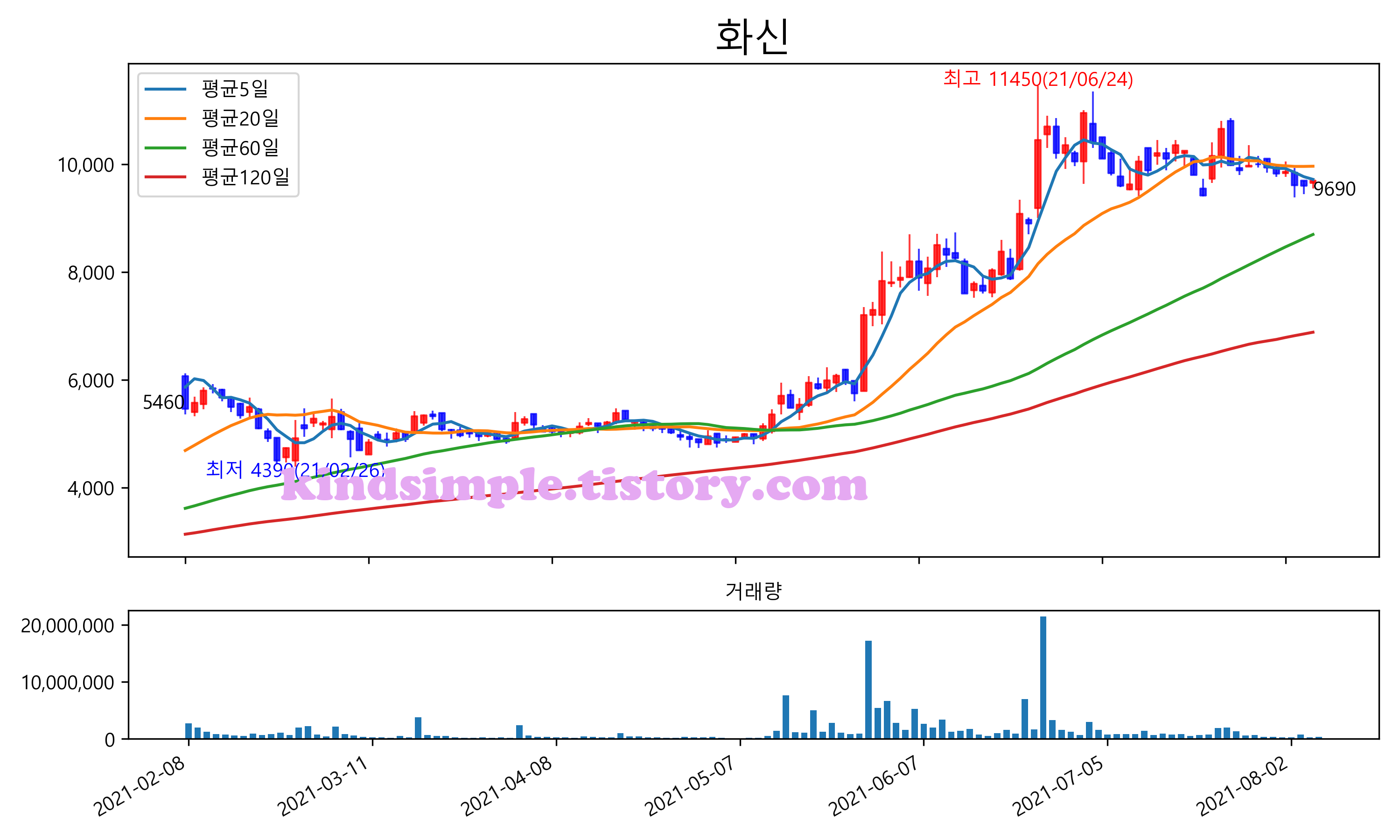 최근 6개월간 캔들차트 및 이동평균선입니다.