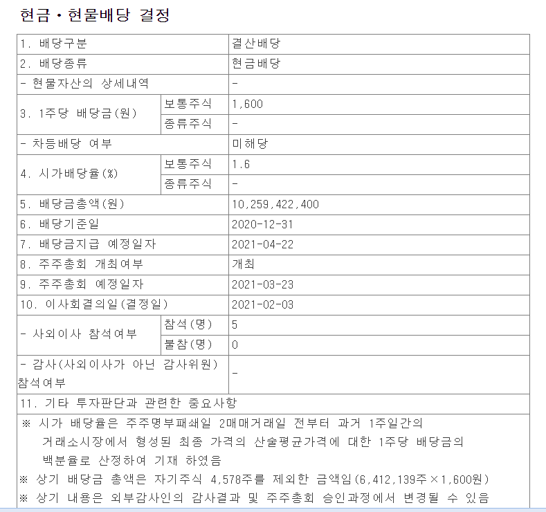 2020년 배당금은 주당 1,600원 입니다. 작년 배당금인 1,300원보다 23.1% 증가했습니다.
