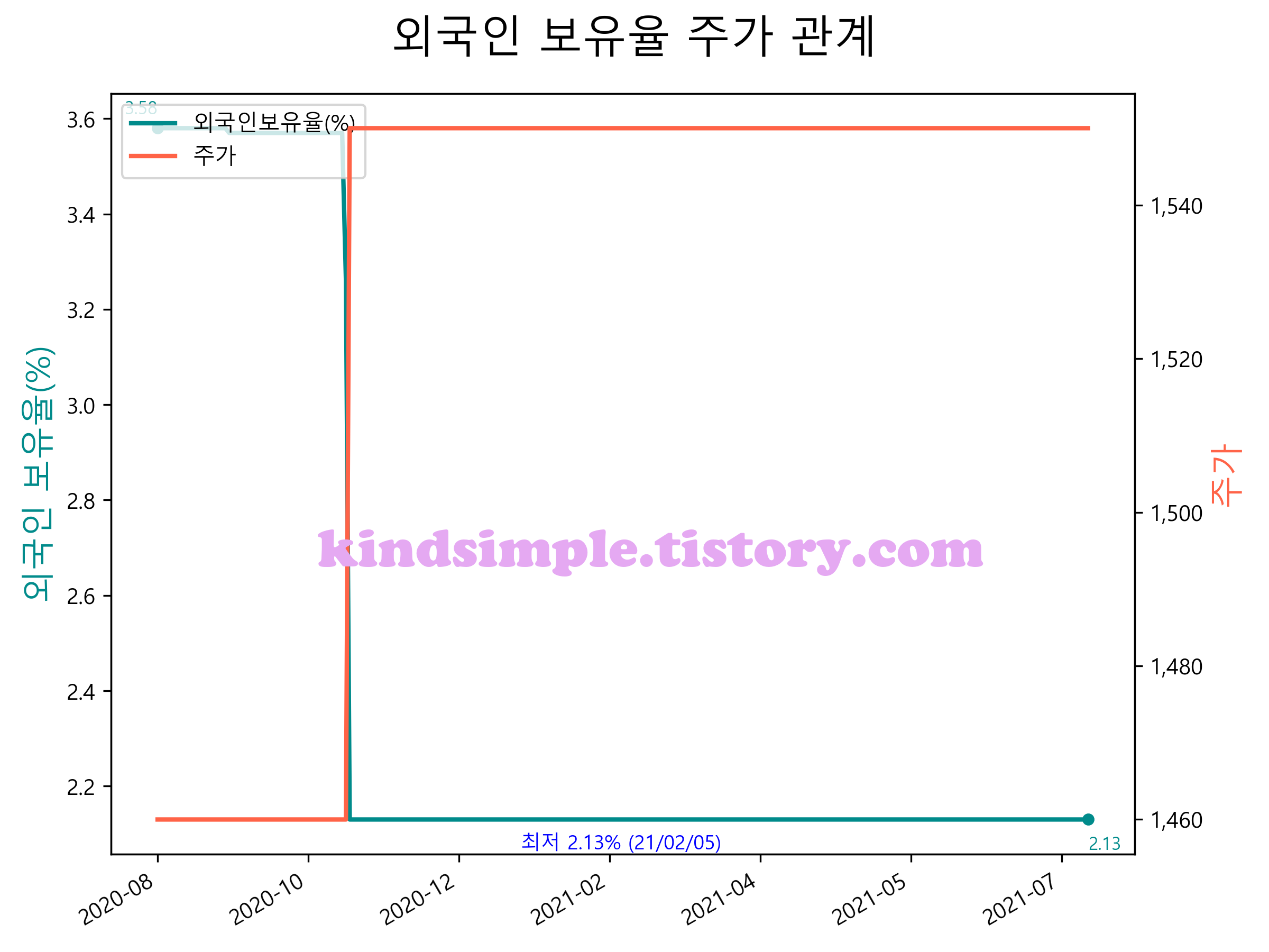 최근 1년간 외국인 보유율 및 주가와의 관계입니다.