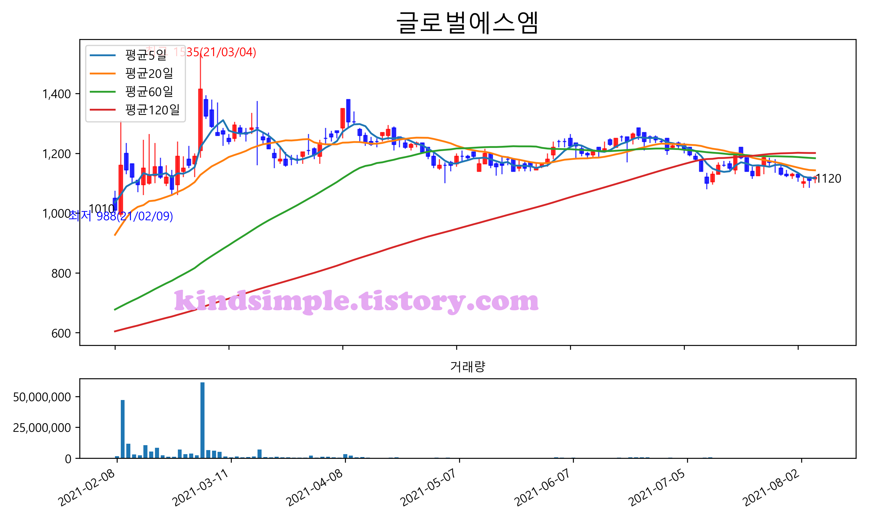 최근 6개월간 캔들차트 및 이동평균선입니다.