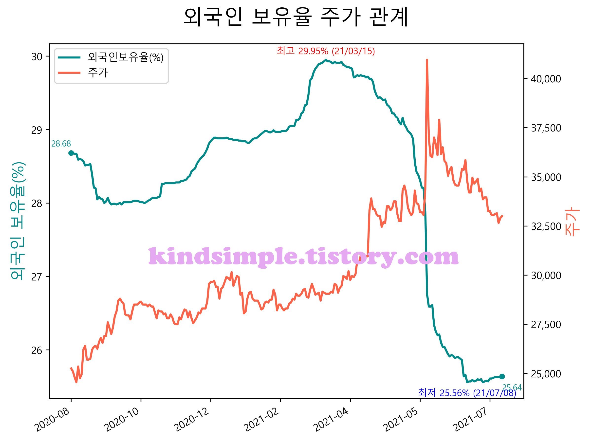 최근 1년간 외국인 보유율 및 주가와의 관계입니다.