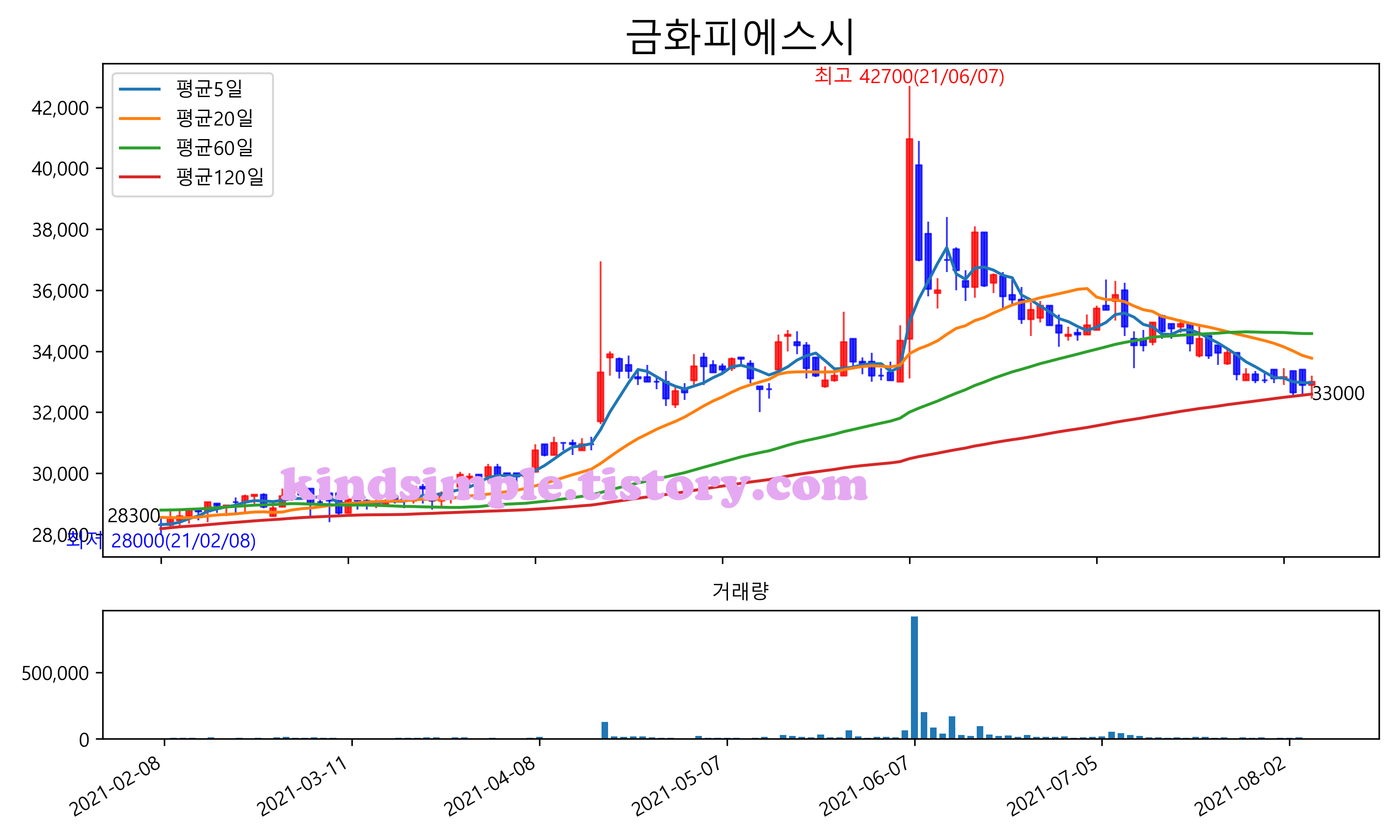 최근 6개월간 캔들차트 및 이동평균선입니다.