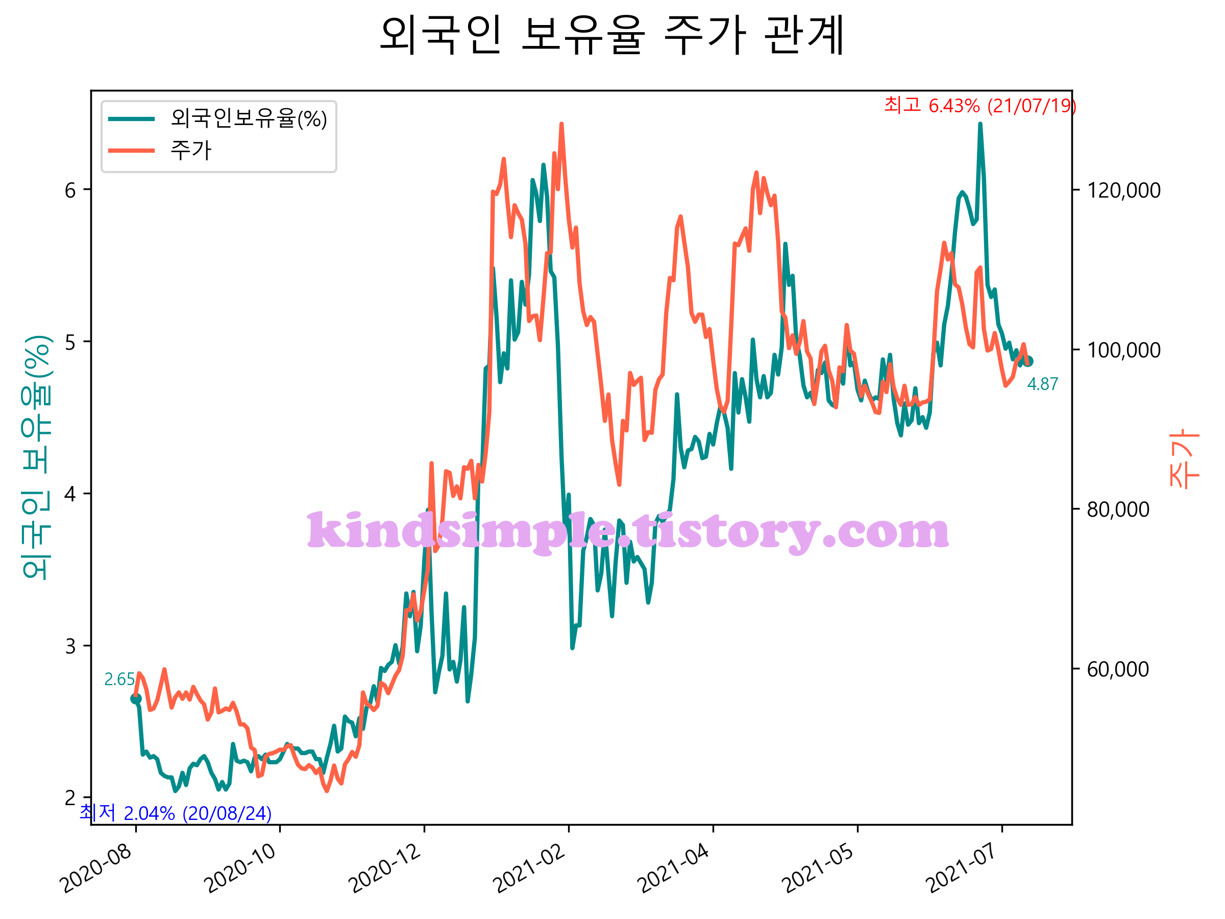 최근 1년간 외국인 보유율 및 주가와의 관계입니다.