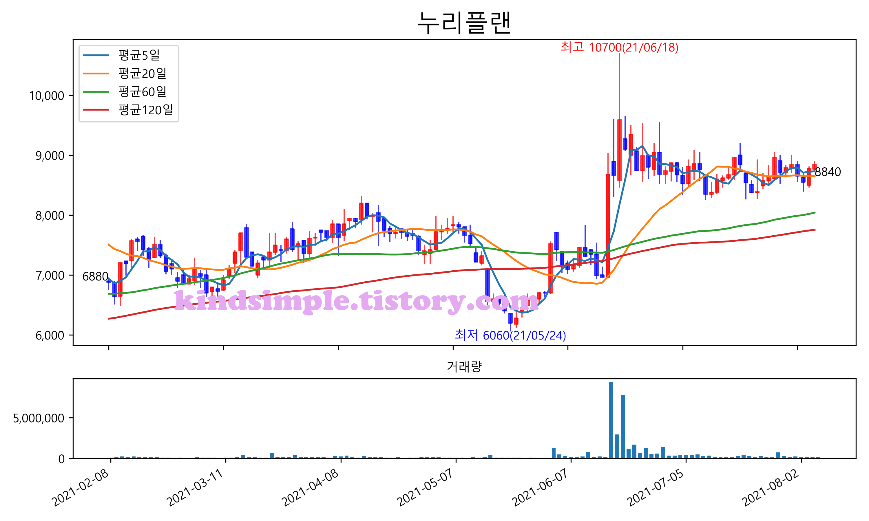 최근 6개월간 캔들차트 및 이동평균선입니다.