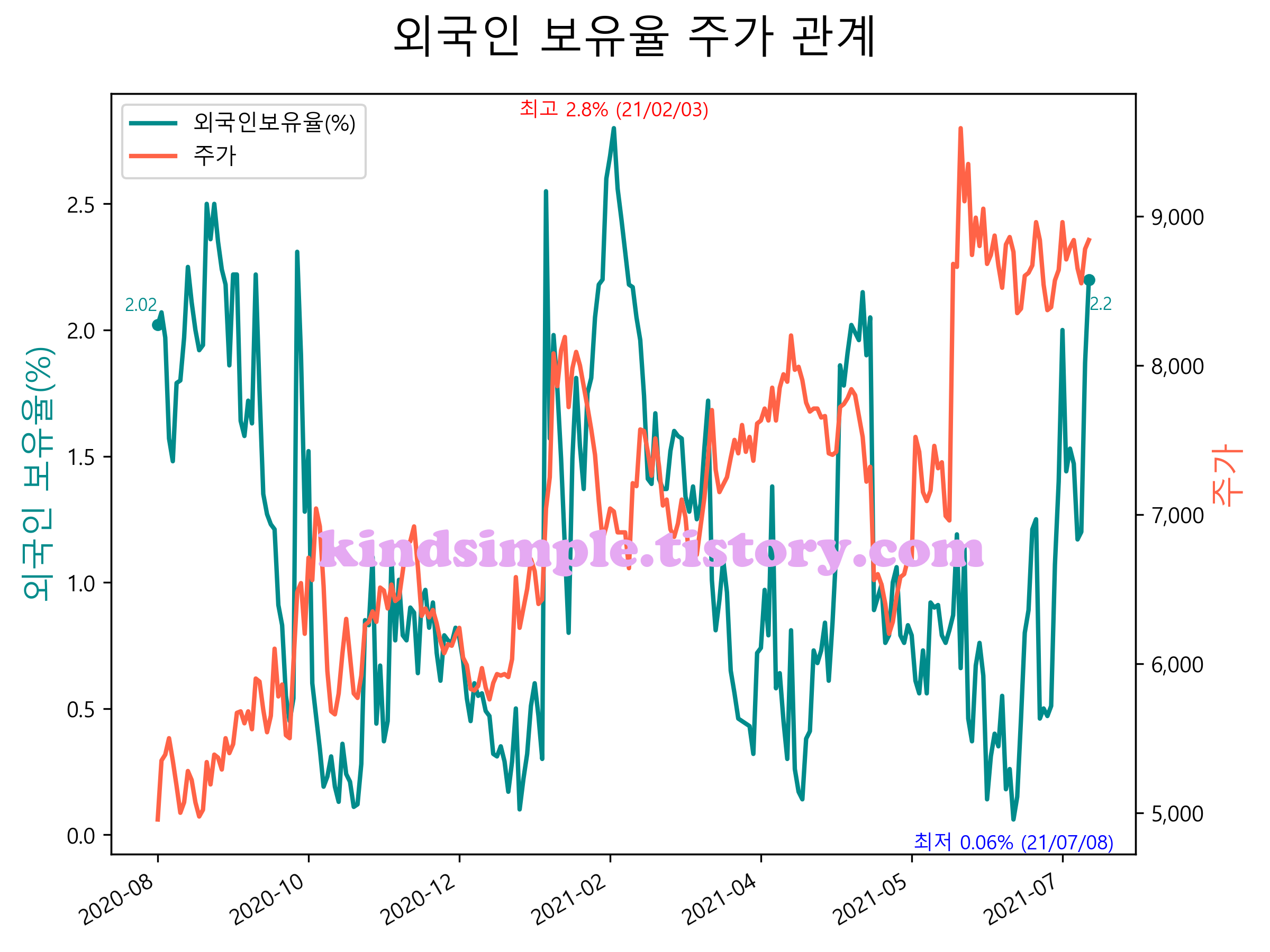 최근 1년간 외국인 보유율 및 주가와의 관계입니다.