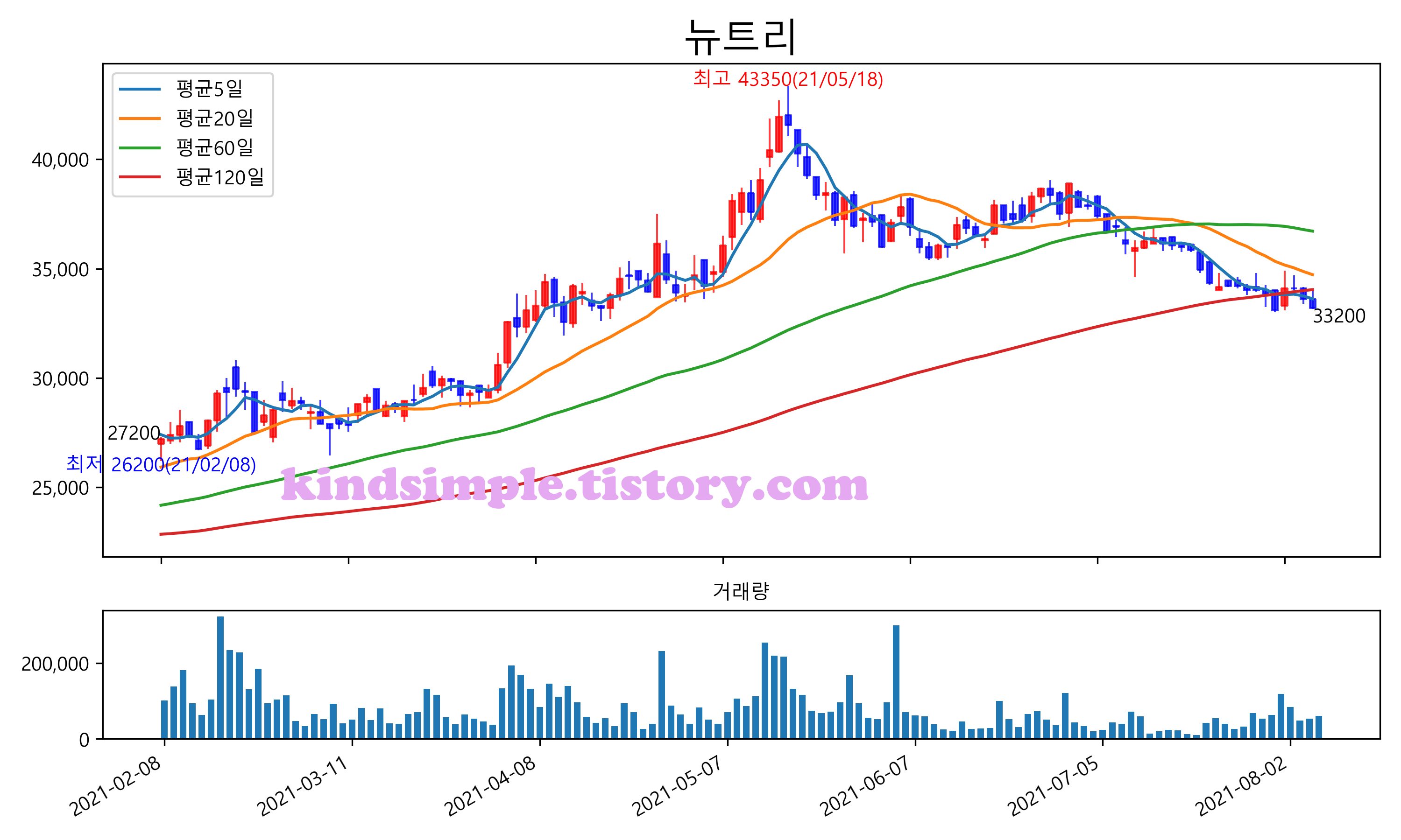 8월 5일 기준 주가는 33,200원 입니다. 아래는 최근 3년간의 주가흐름입니다.