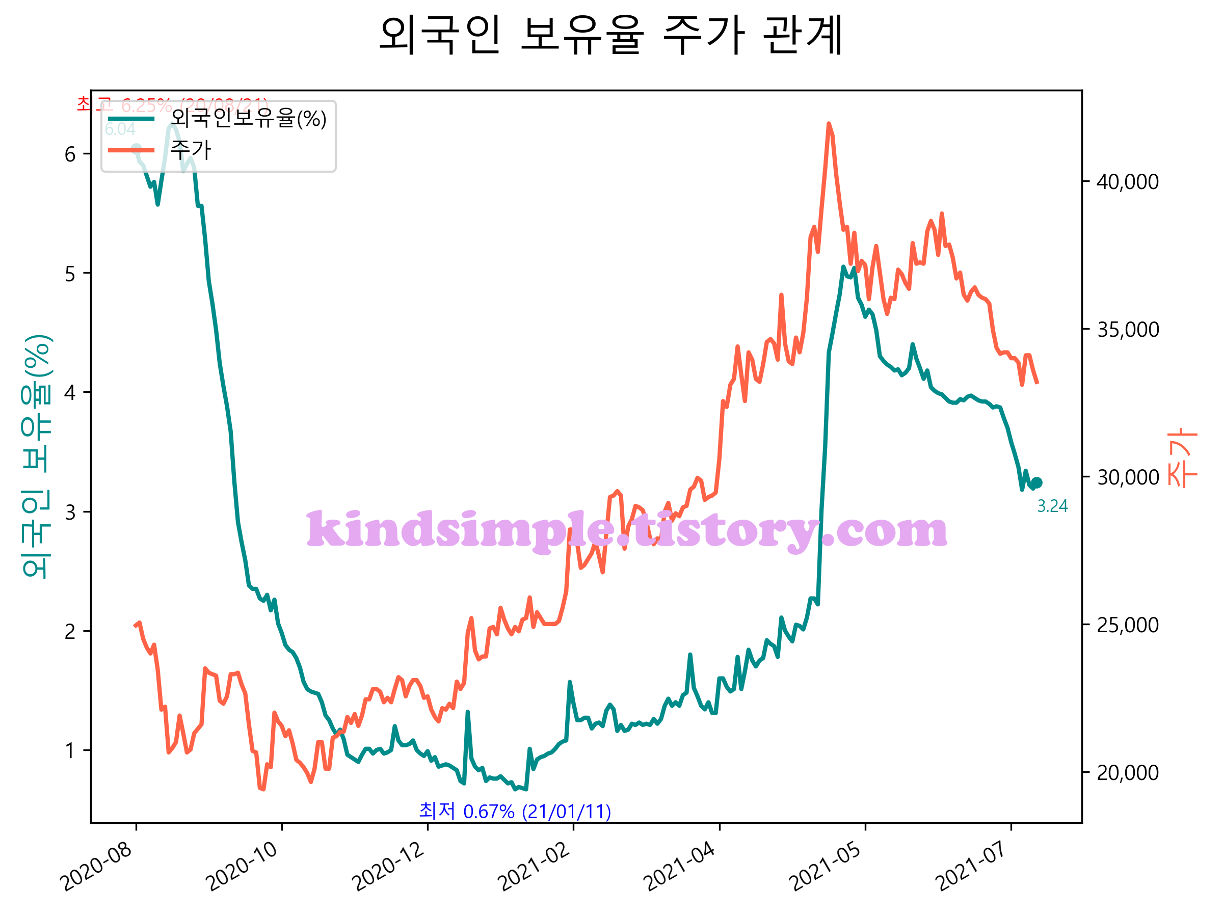 최근 1년간 외국인 보유율 및 주가와의 관계입니다.