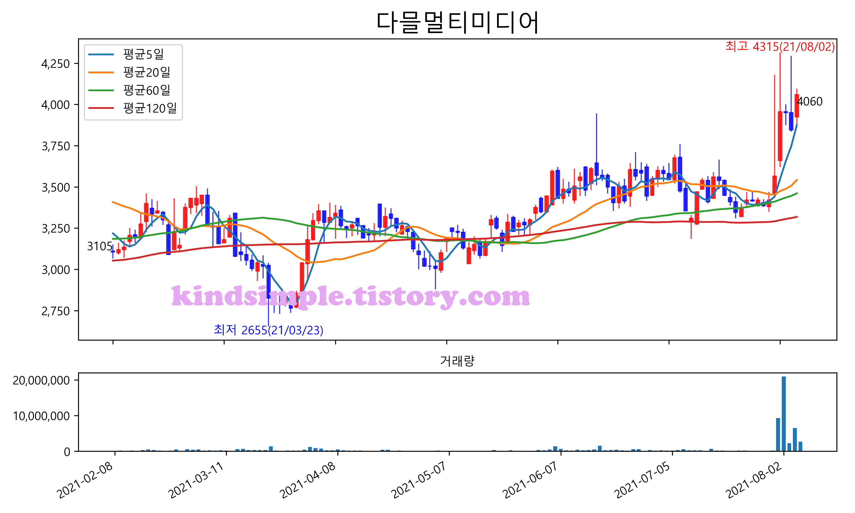 최근 6개월간 캔들차트 및 이동평균선입니다.