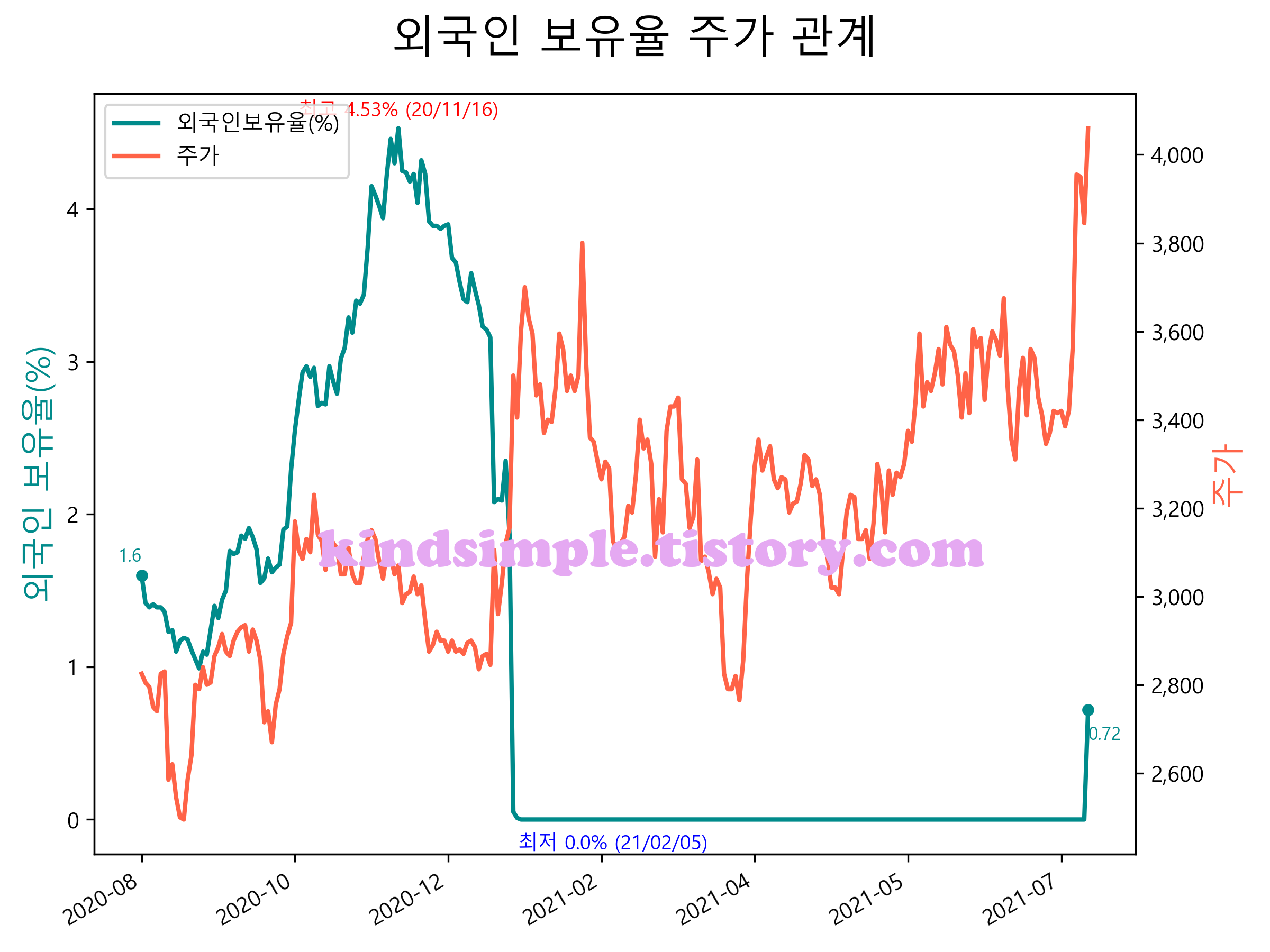 최근 1년간 외국인 보유율 및 주가와의 관계입니다.