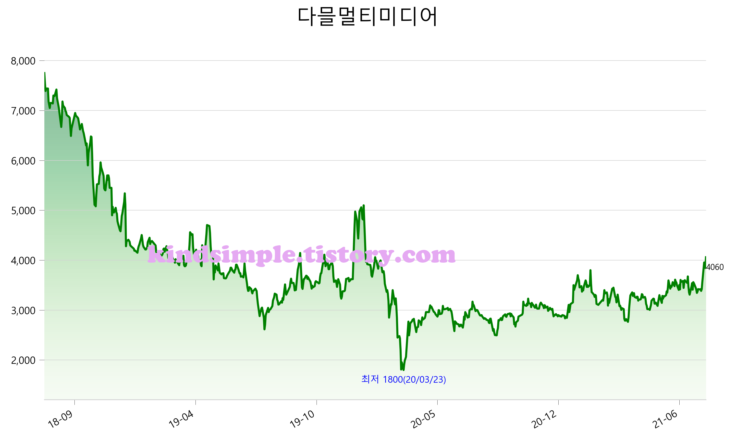 8월 5일 기준 주가는 4,060원 입니다. 아래는 최근 3년간의 주가흐름입니다.