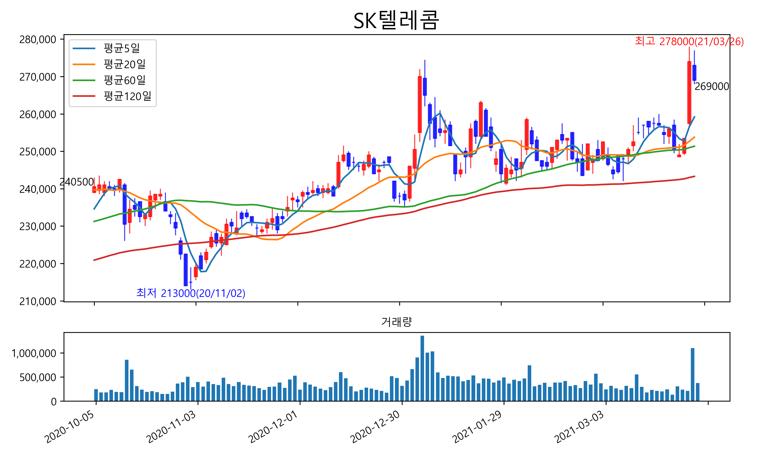 최근 6개월간 캔들차트 및 이동평균선입니다.