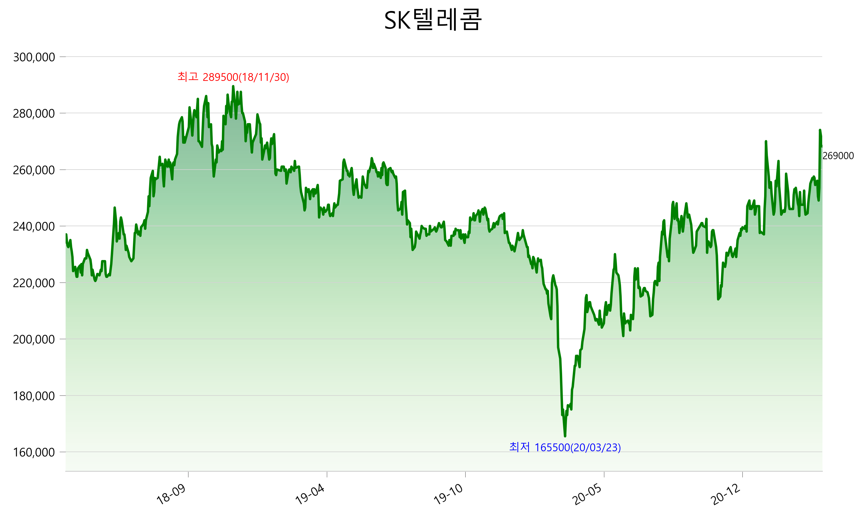 2021년 03월 29일 기준 주가는 269,000원 입니다. 아래는 최근 3년간의 주가흐름입니다.