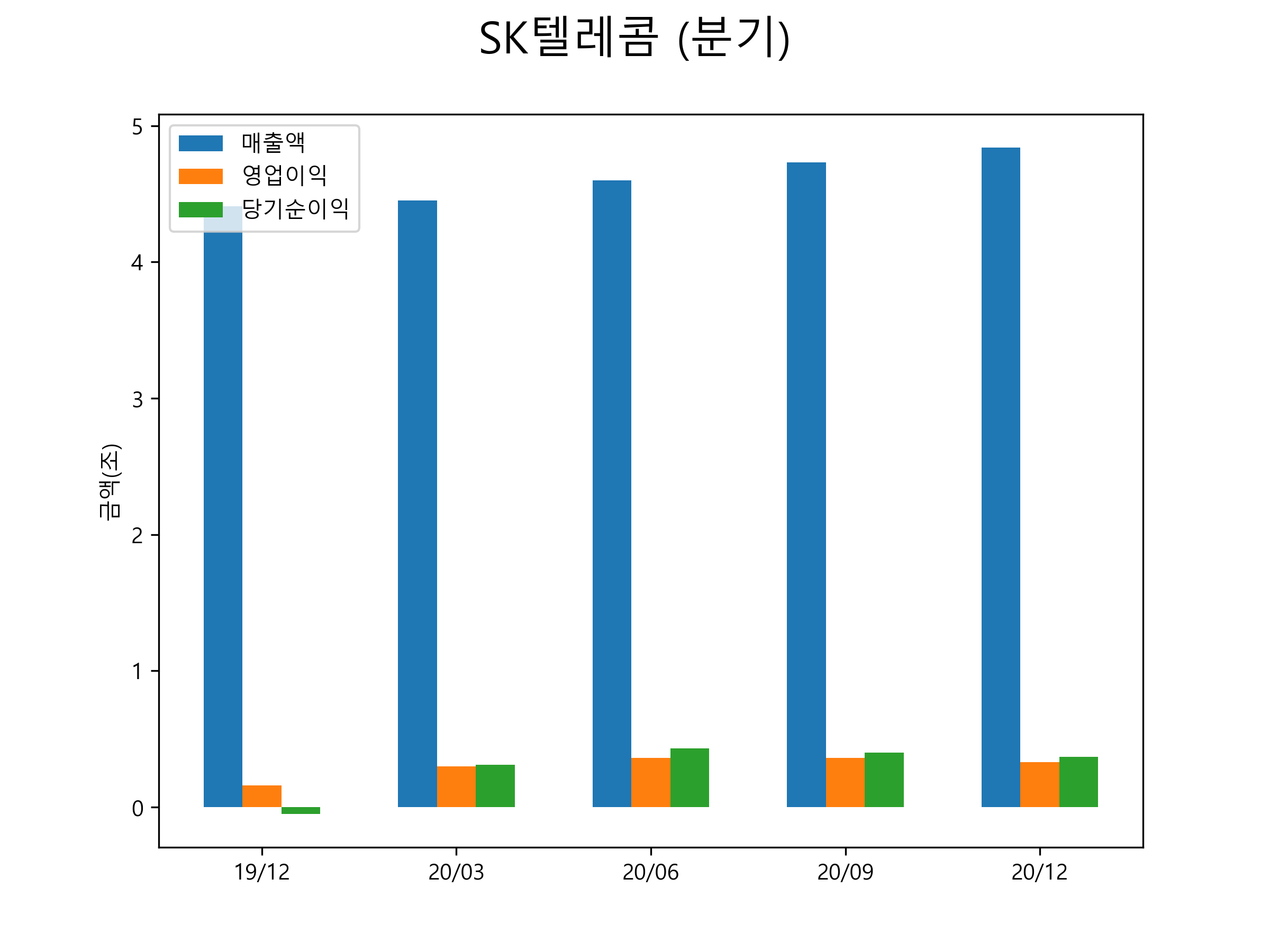 SK텔레콤의 2020년 4분기 매출은 4조 8406억원, 영업이익 3263억원, 당기순이익 3659억원을 기록했습니다. SK텔레콤의 분기별 매출 및 영업이익, 당기순이익 표입니다.