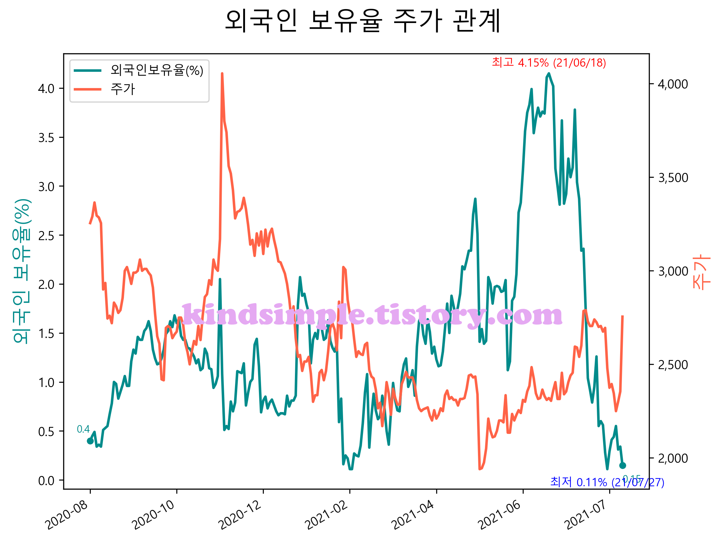 최근 1년간 외국인 보유율 및 주가와의 관계입니다.