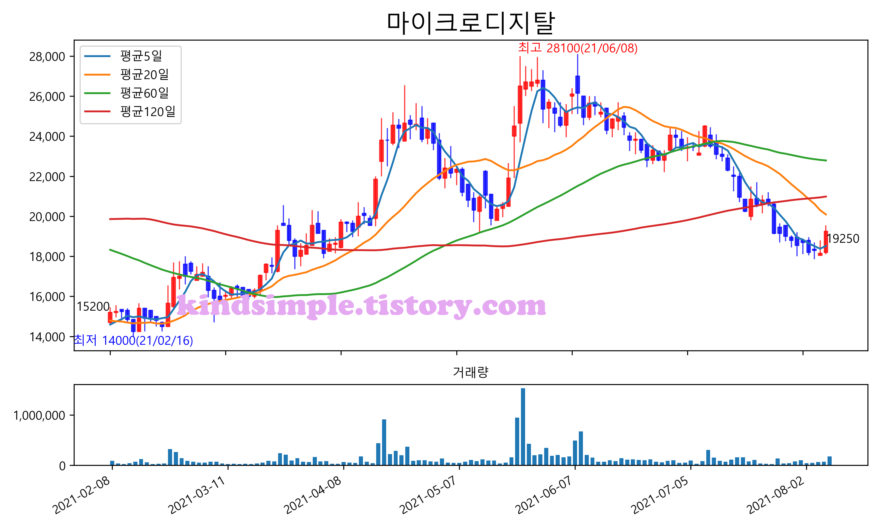 최근 6개월간 캔들차트 및 이동평균선입니다.
