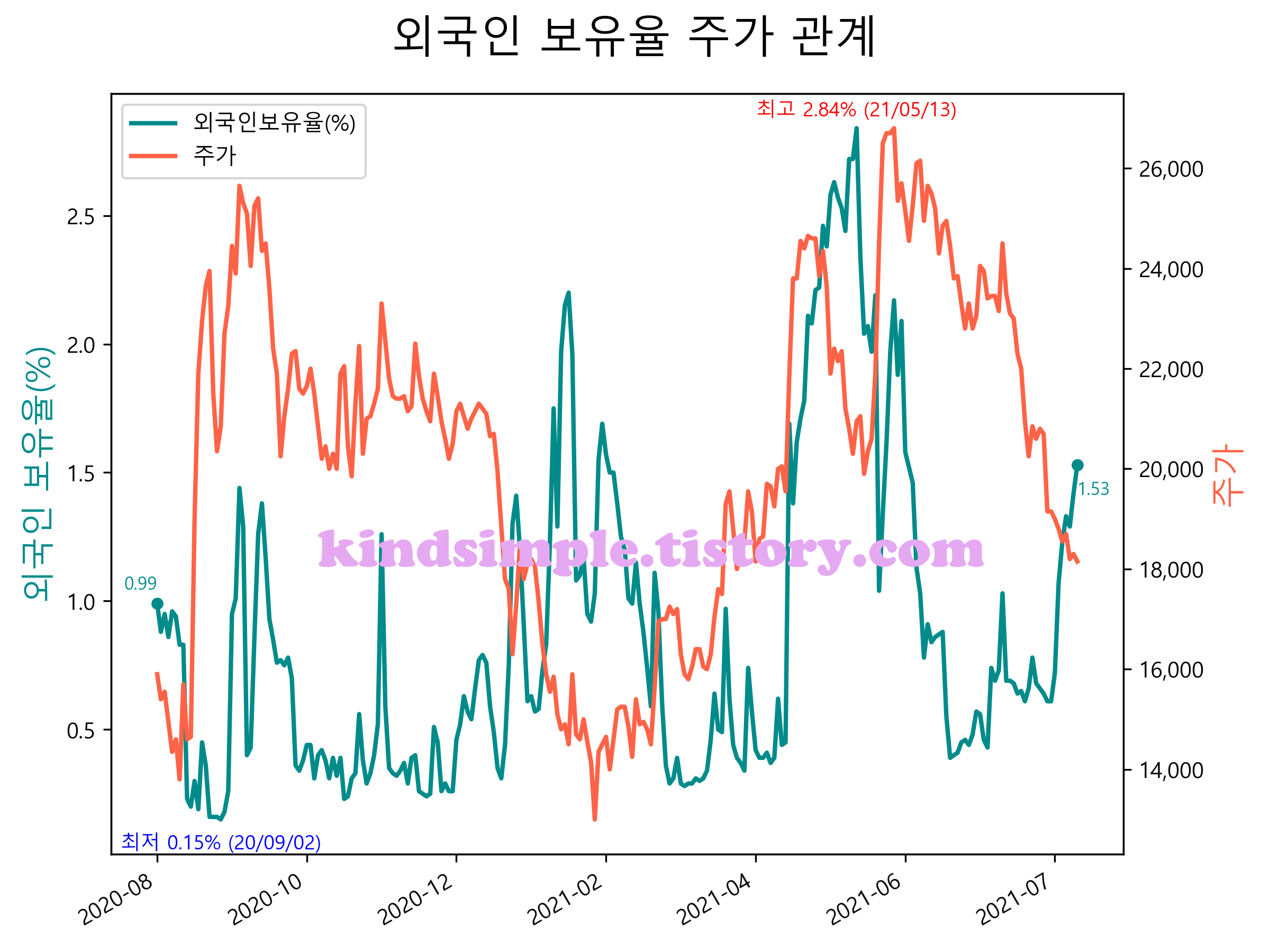 최근 1년간 외국인 보유율 및 주가와의 관계입니다.