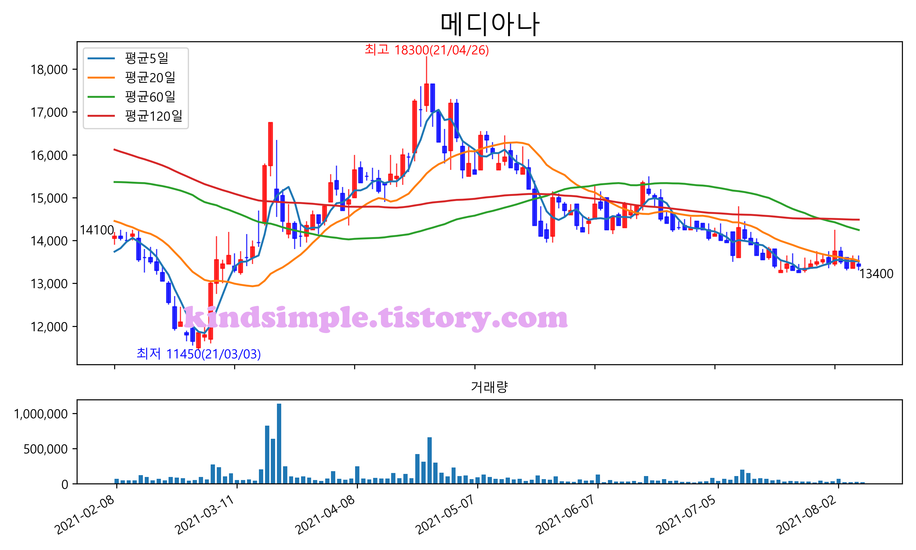최근 6개월간 캔들차트 및 이동평균선입니다.
