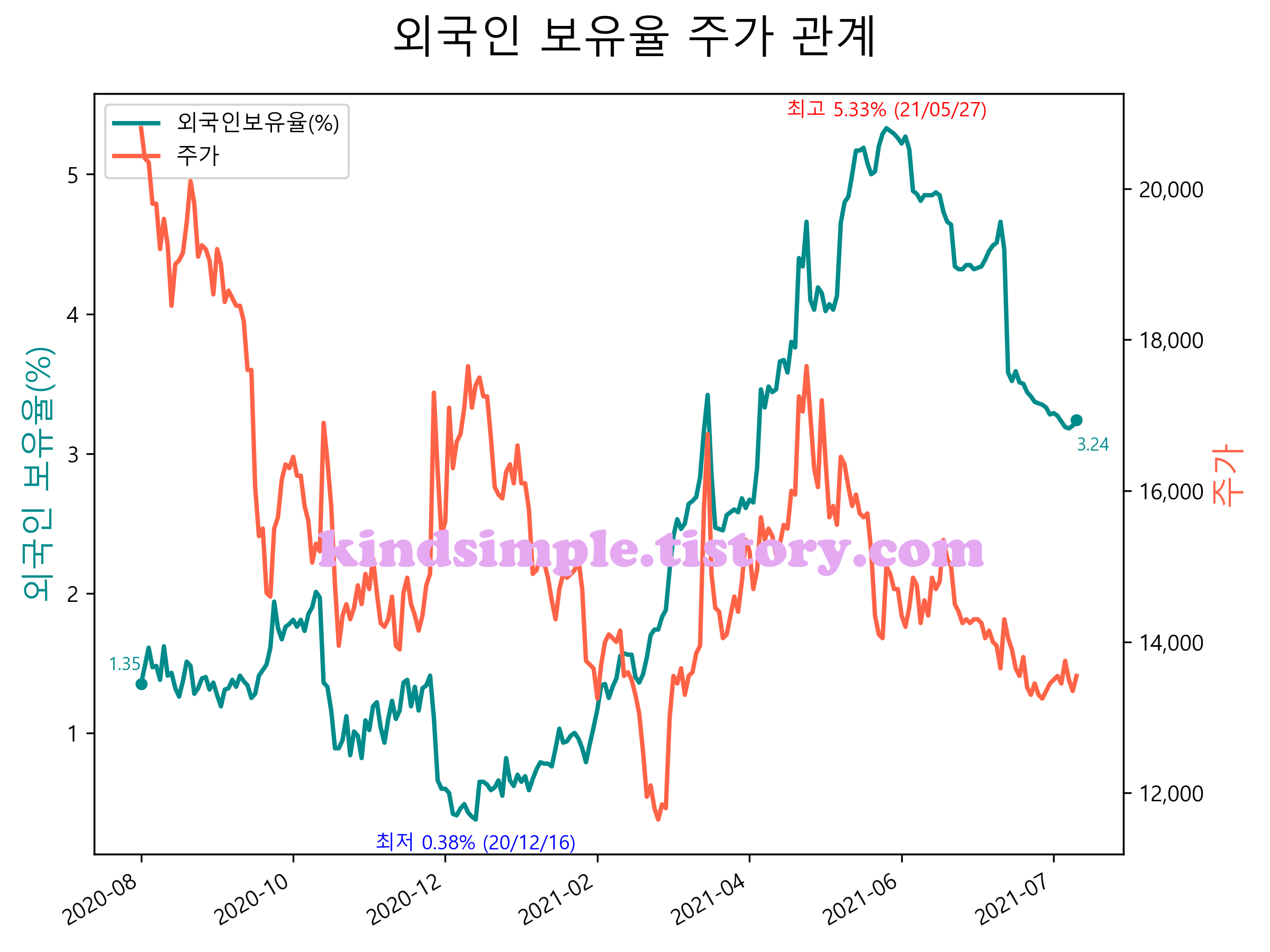 최근 1년간 외국인 보유율 및 주가와의 관계입니다.