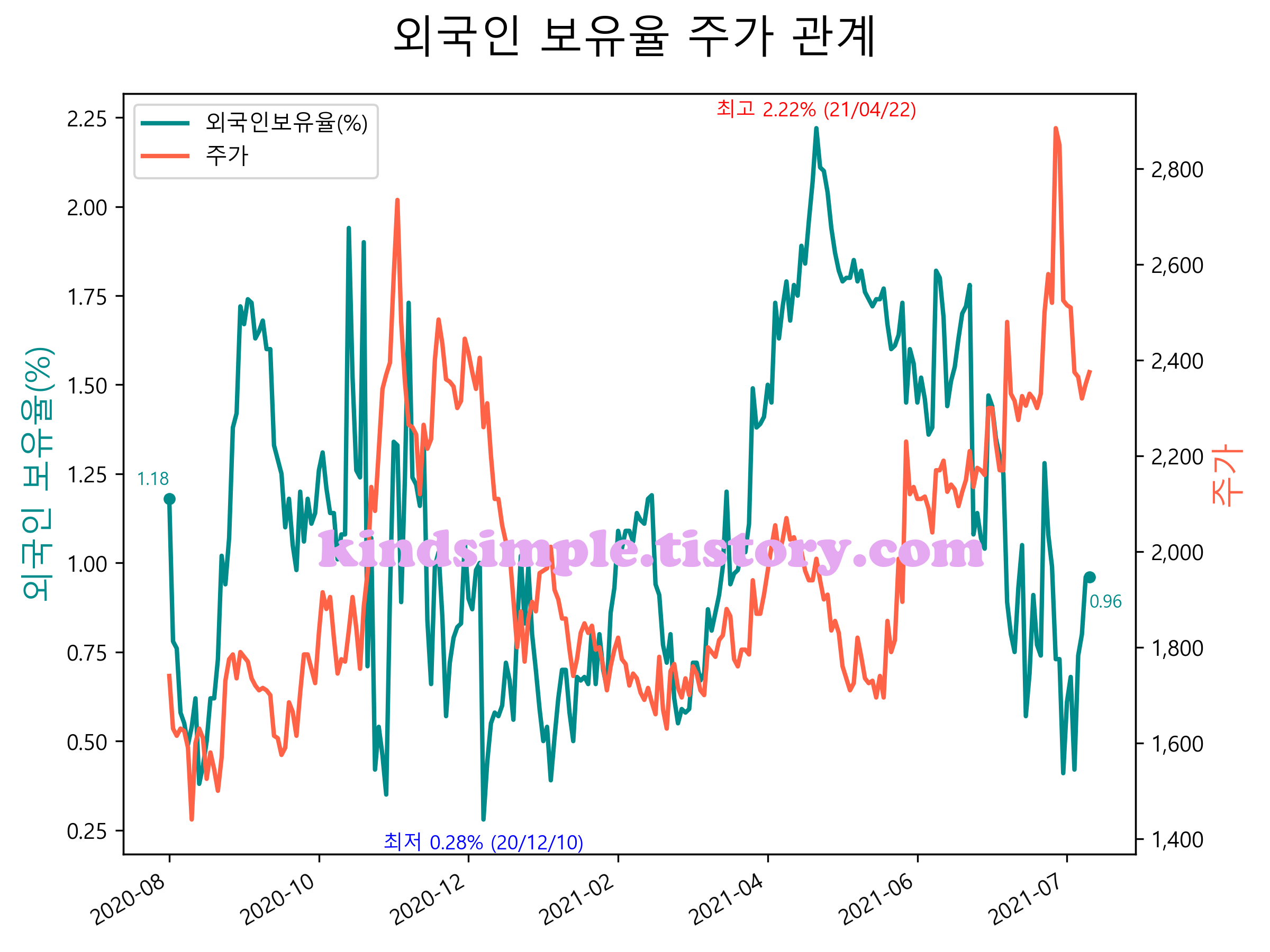 최근 1년간 외국인 보유율 및 주가와의 관계입니다.