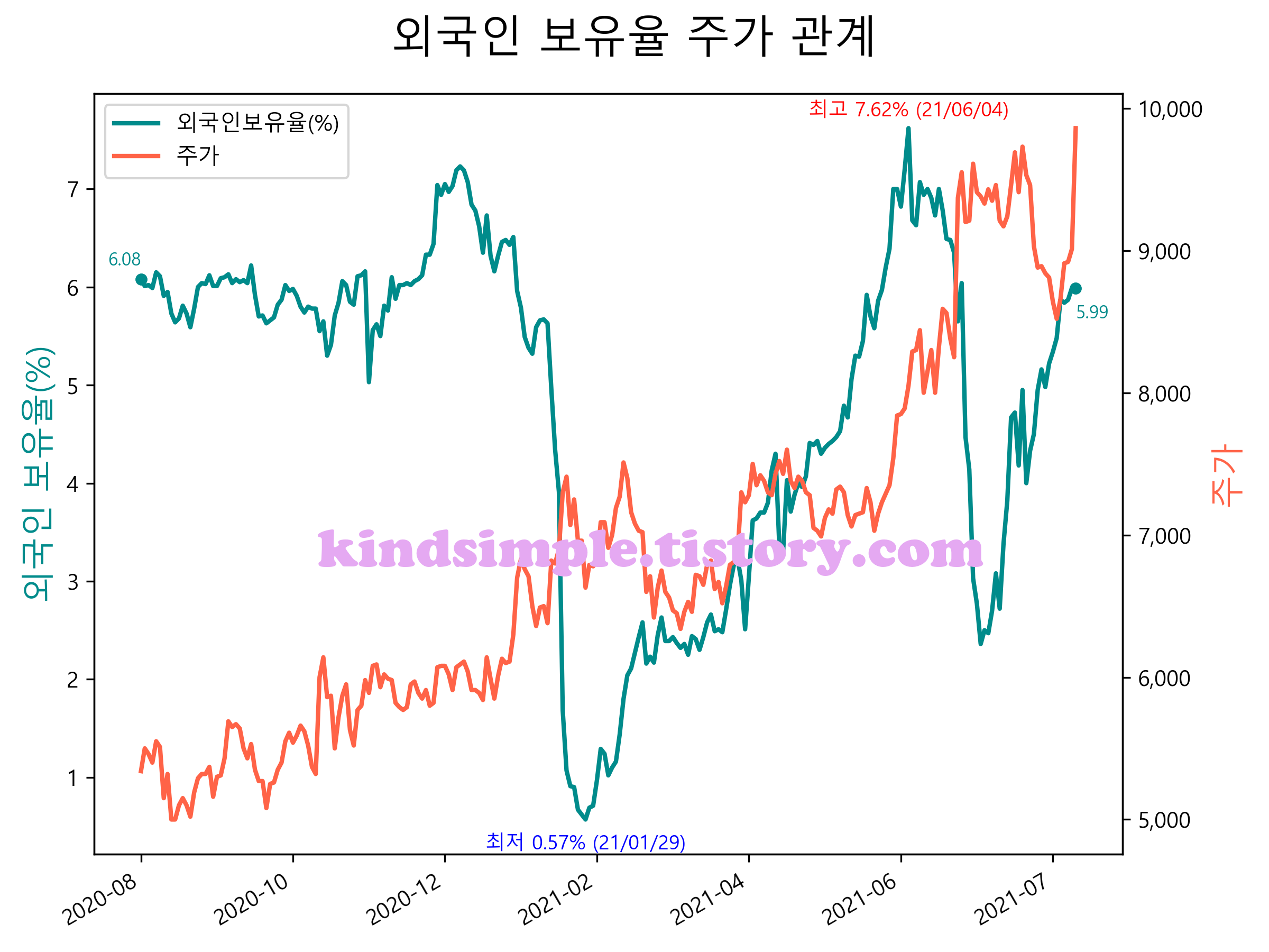 최근 1년간 외국인 보유율 및 주가와의 관계입니다.