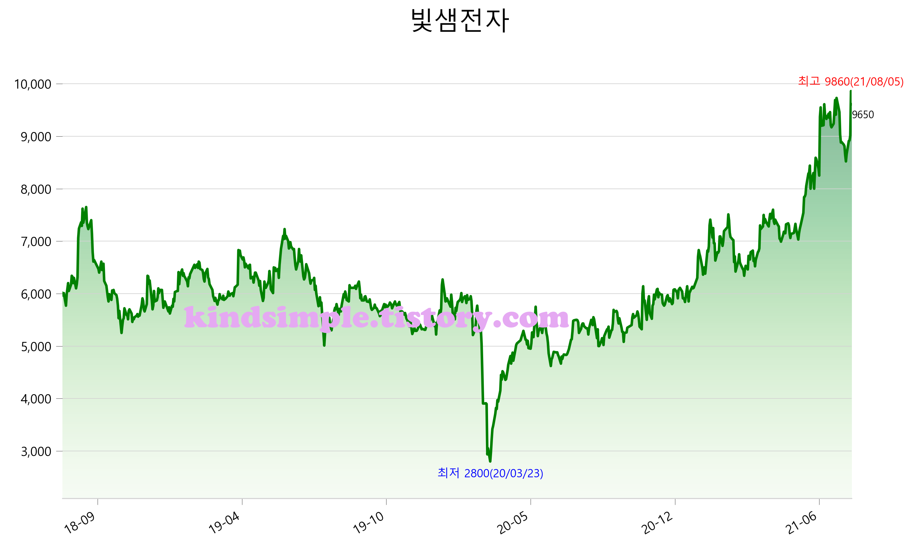 8월 6일 기준 주가는 9,650원 입니다. 아래는 최근 3년간의 주가흐름입니다.
