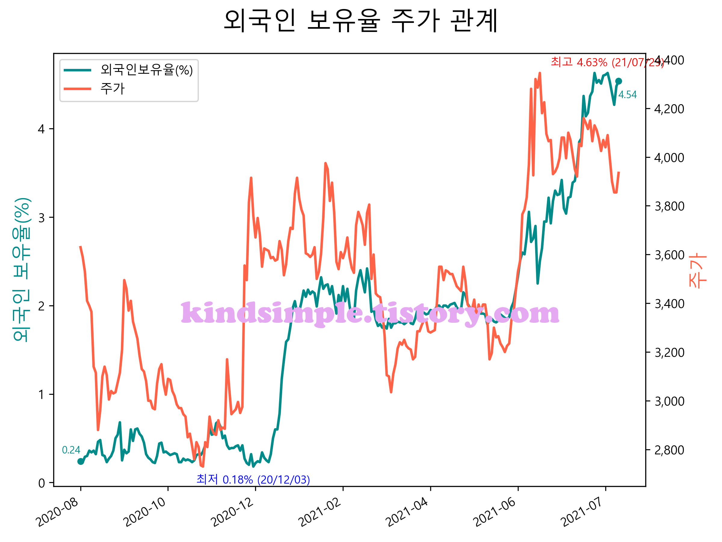 최근 1년간 외국인 보유율 및 주가와의 관계입니다.