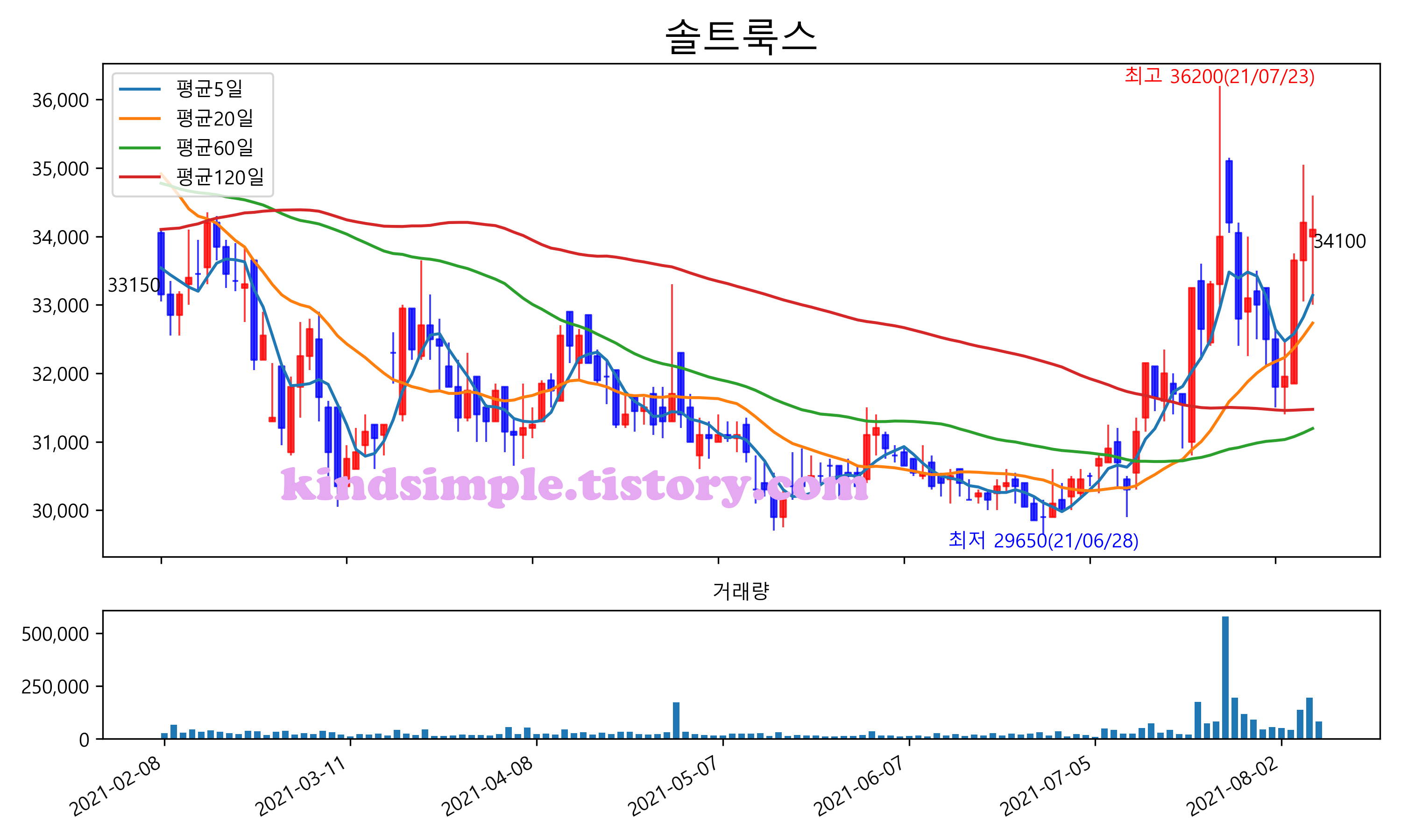 최근 6개월간 캔들차트 및 이동평균선입니다.