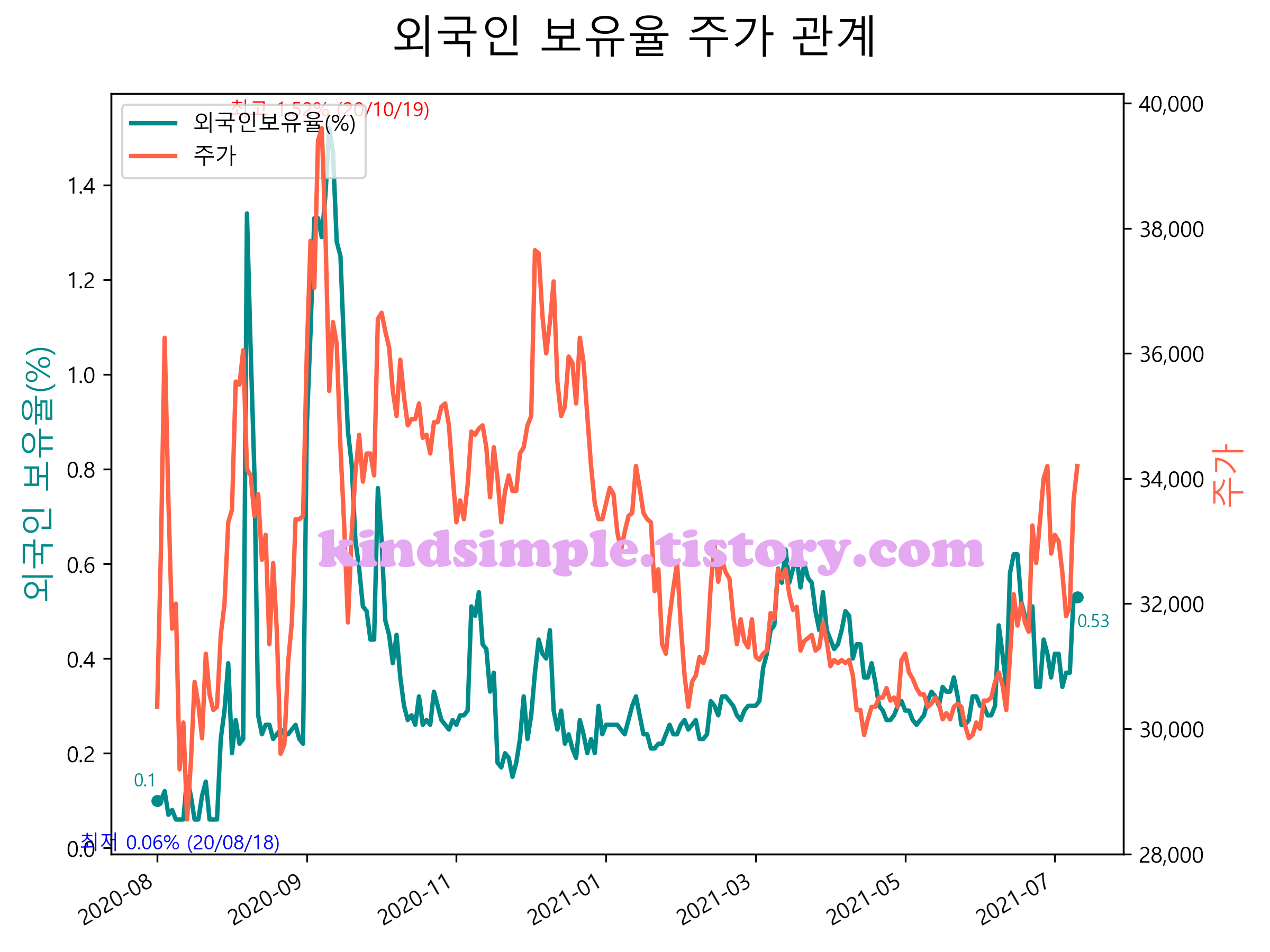 최근 1년간 외국인 보유율 및 주가와의 관계입니다.