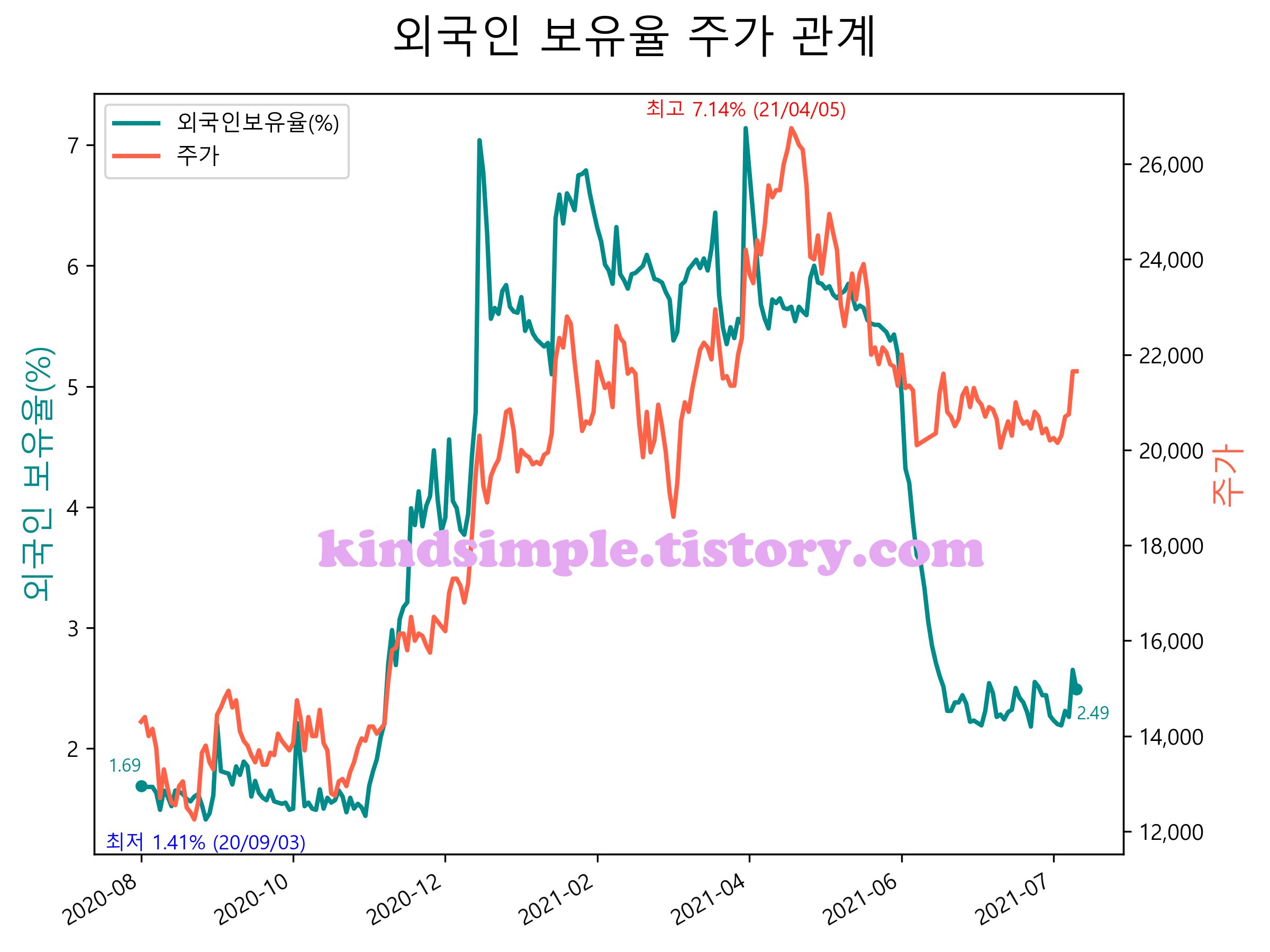 최근 1년간 외국인 보유율 및 주가와의 관계입니다.