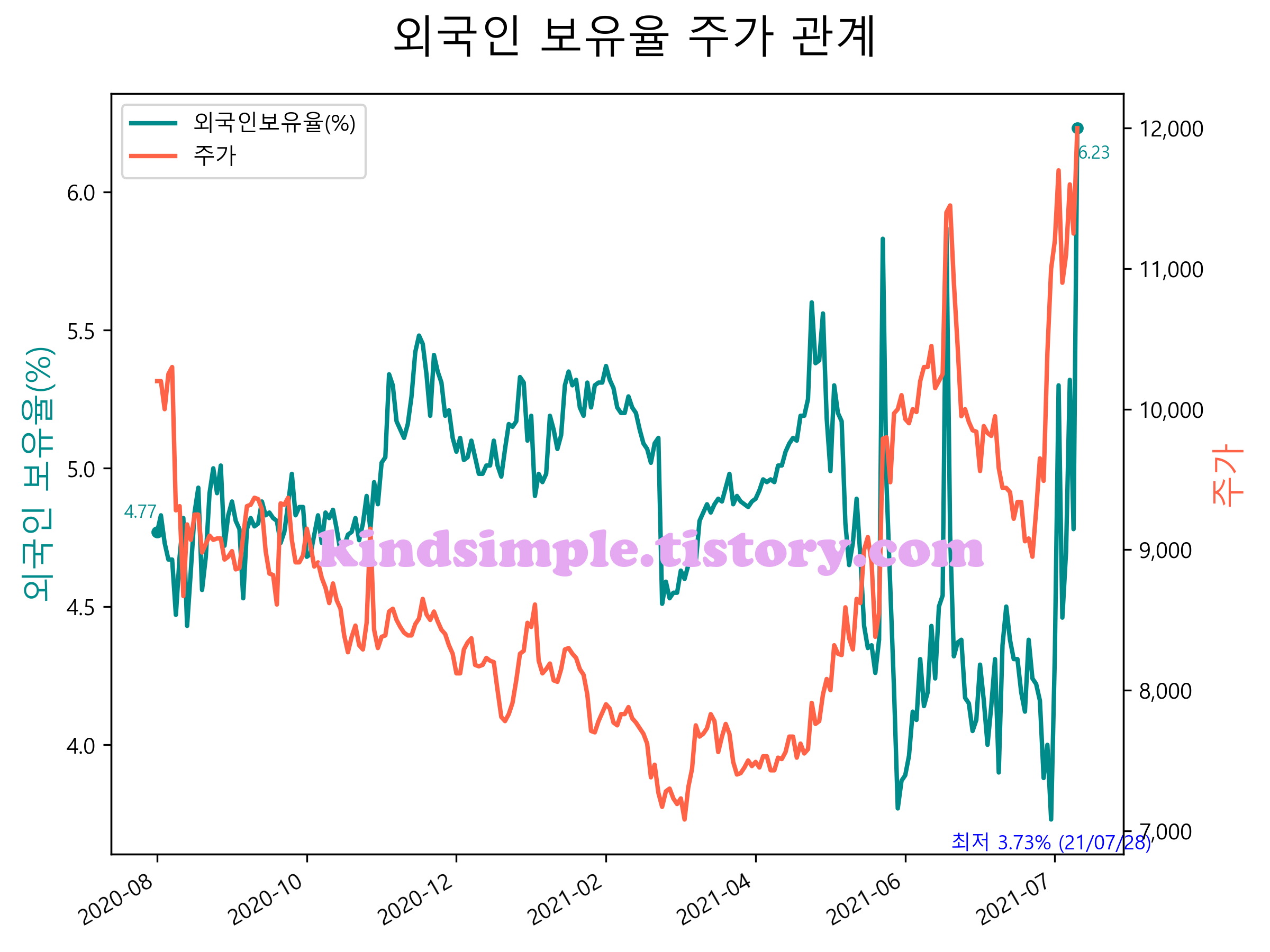 최근 1년간 외국인 보유율 및 주가와의 관계입니다.
