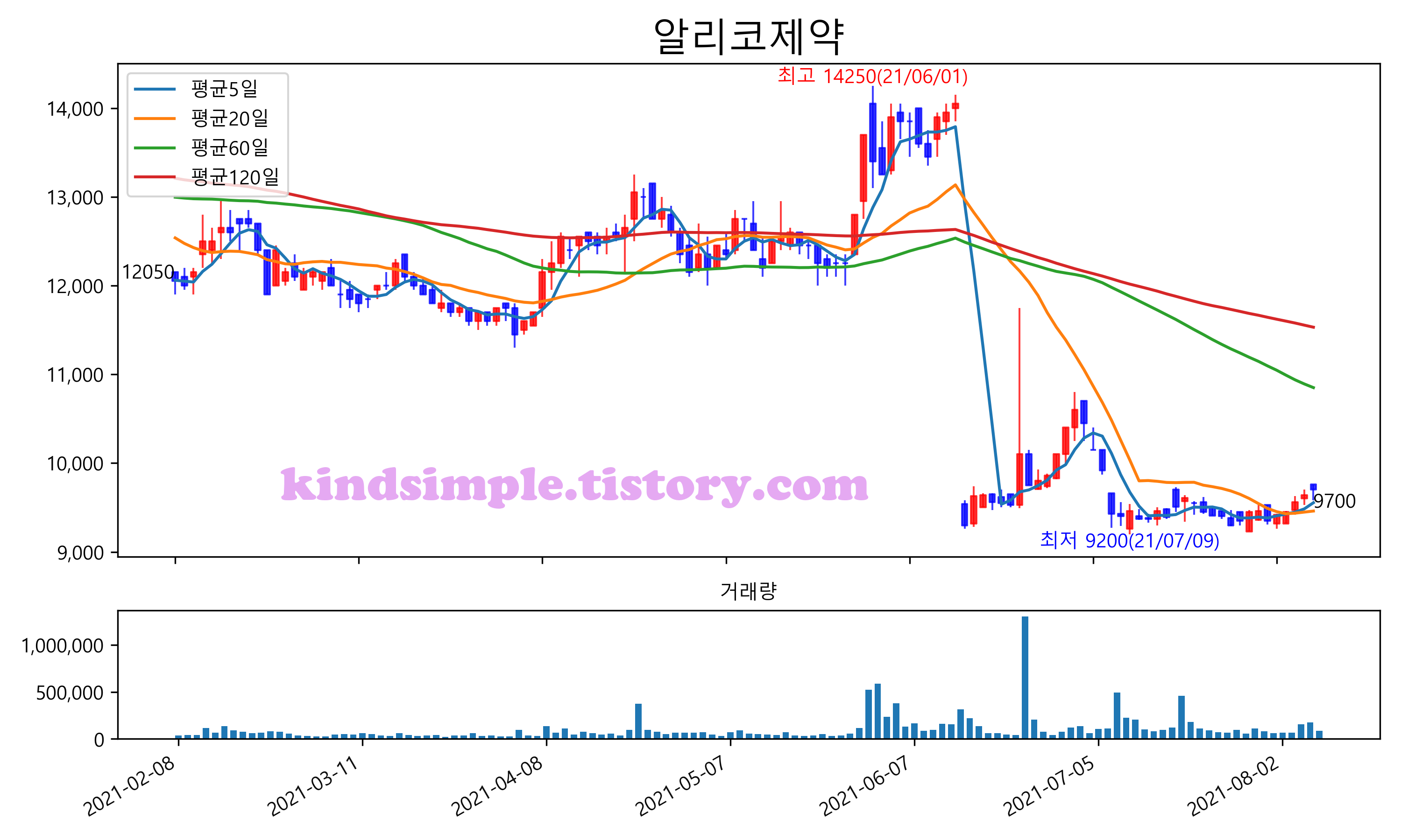 최근 6개월간 캔들차트 및 이동평균선입니다.