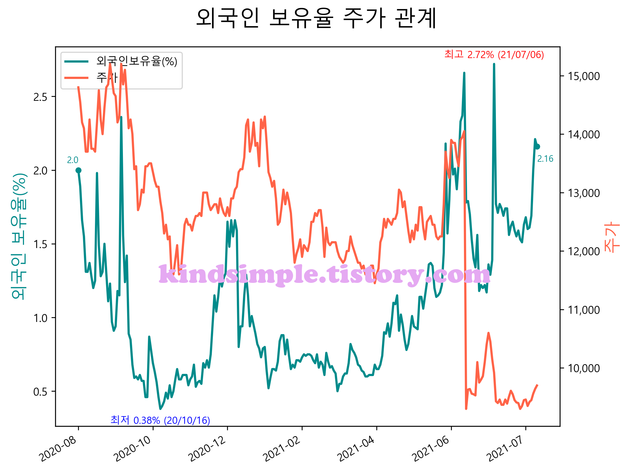 최근 1년간 외국인 보유율 및 주가와의 관계입니다.