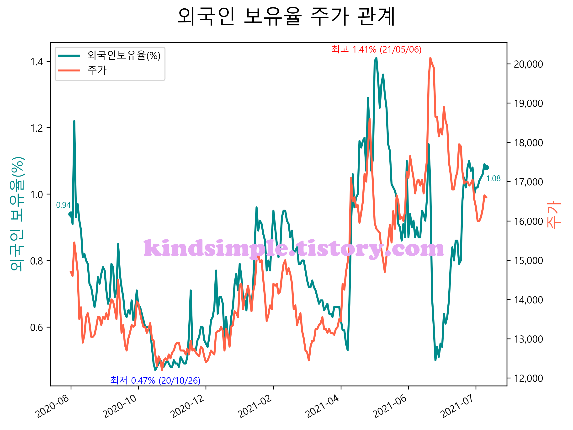 최근 1년간 외국인 보유율 및 주가와의 관계입니다.