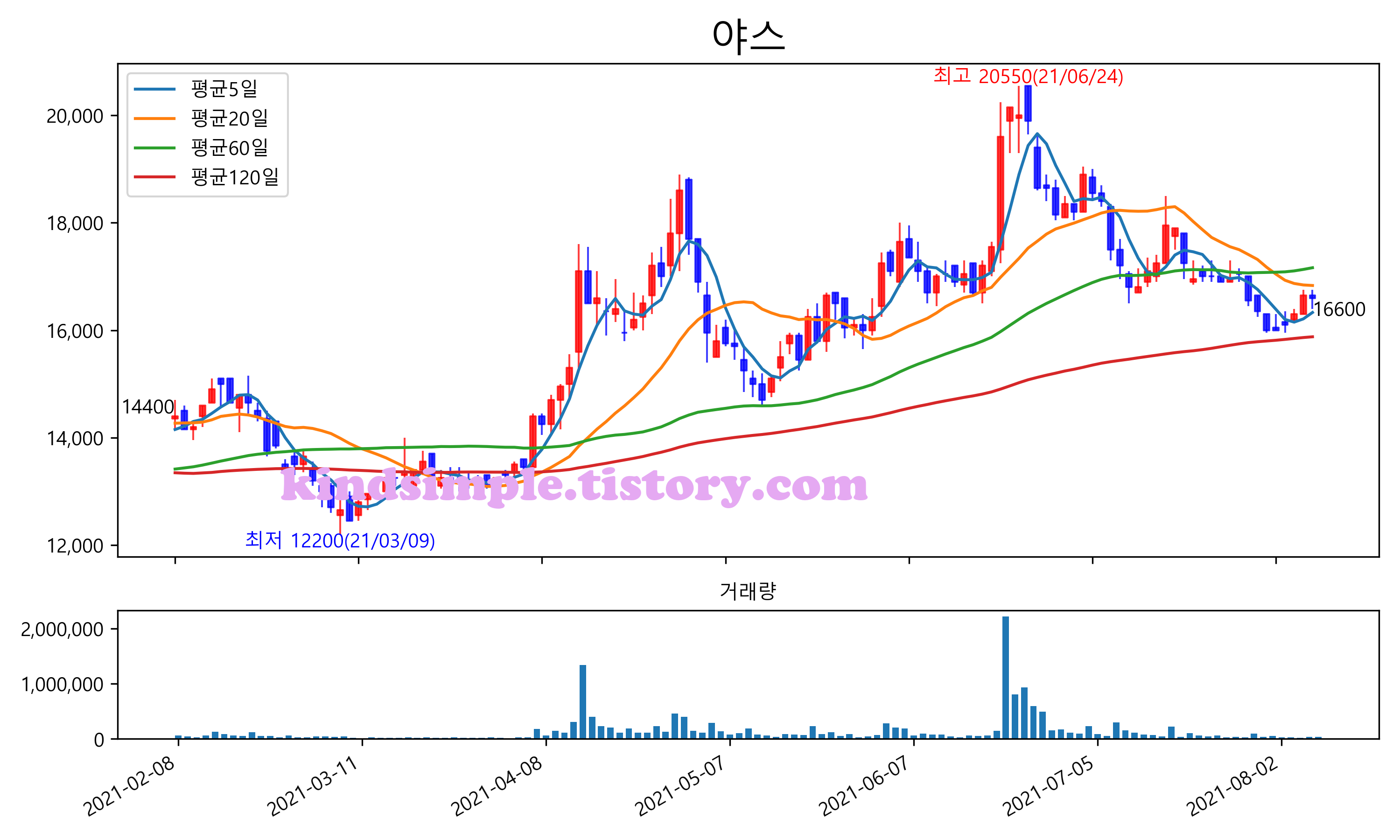 최근 6개월간 캔들차트 및 이동평균선입니다.
