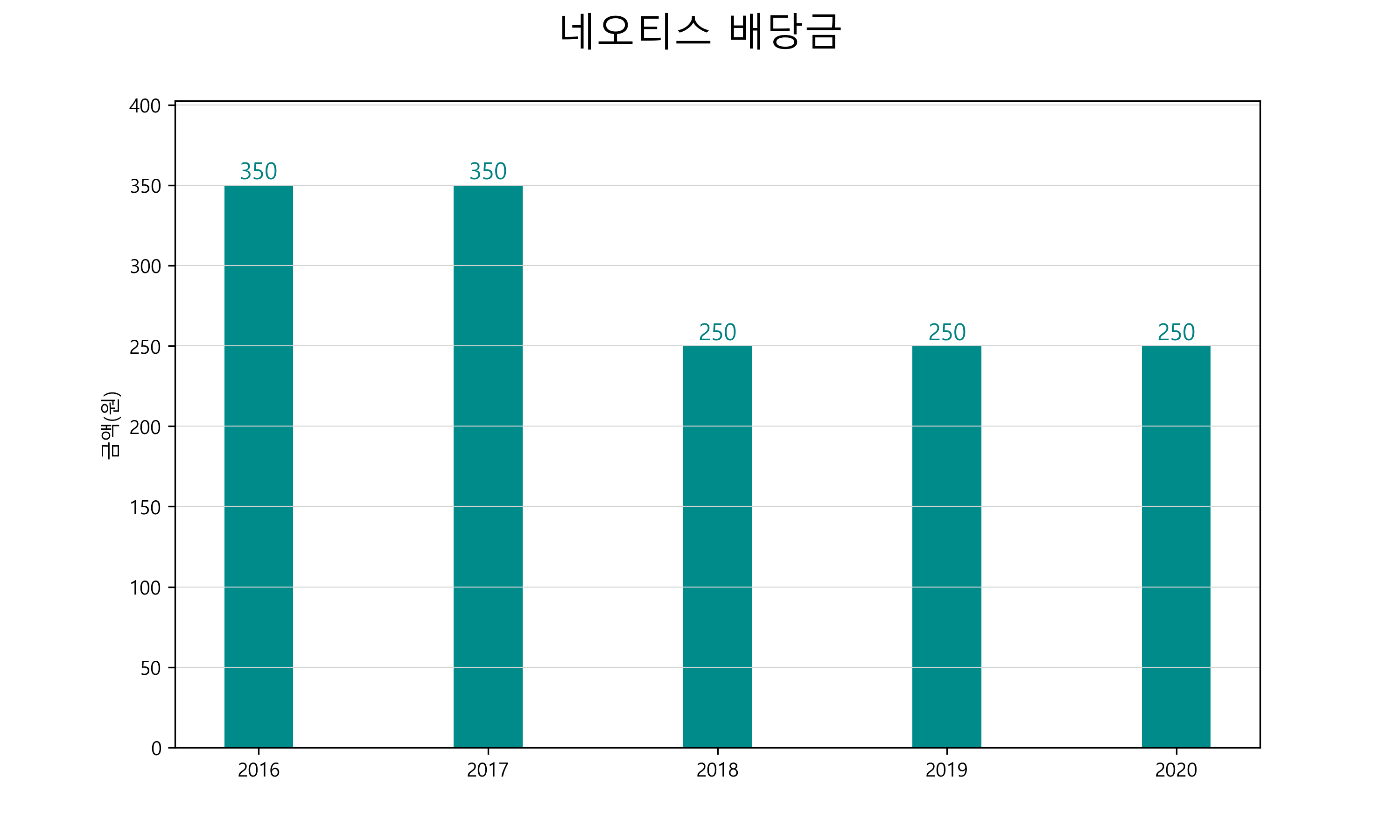 네오티스은 1년에 1번 배당을 실시하고 있으며 2021년 4월 23일에 배당금을 지급합니다.