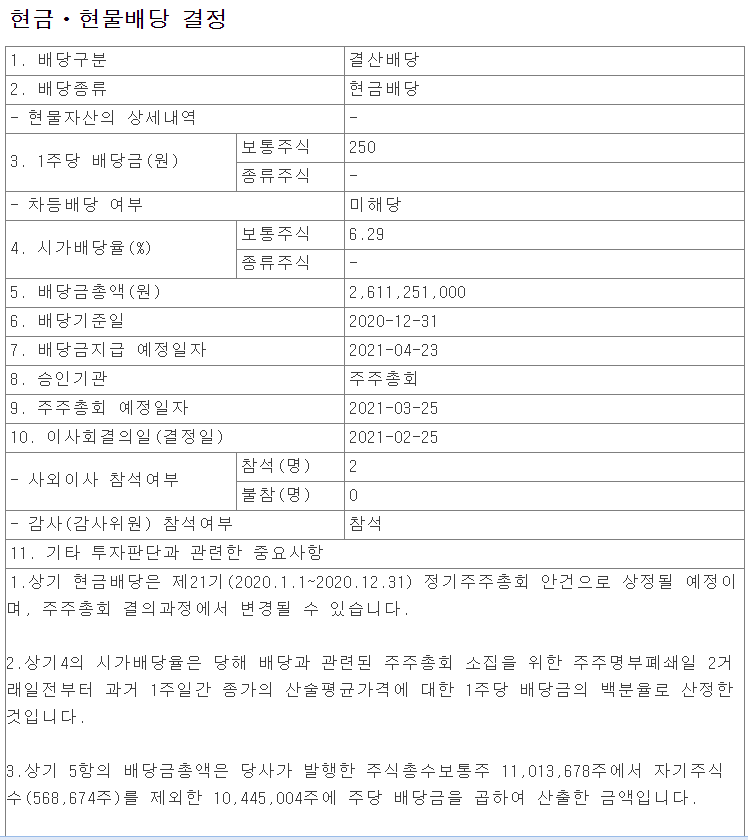 2020년 배당금은 주당 250원 입니다. 작년 배당금과 동일합니다.