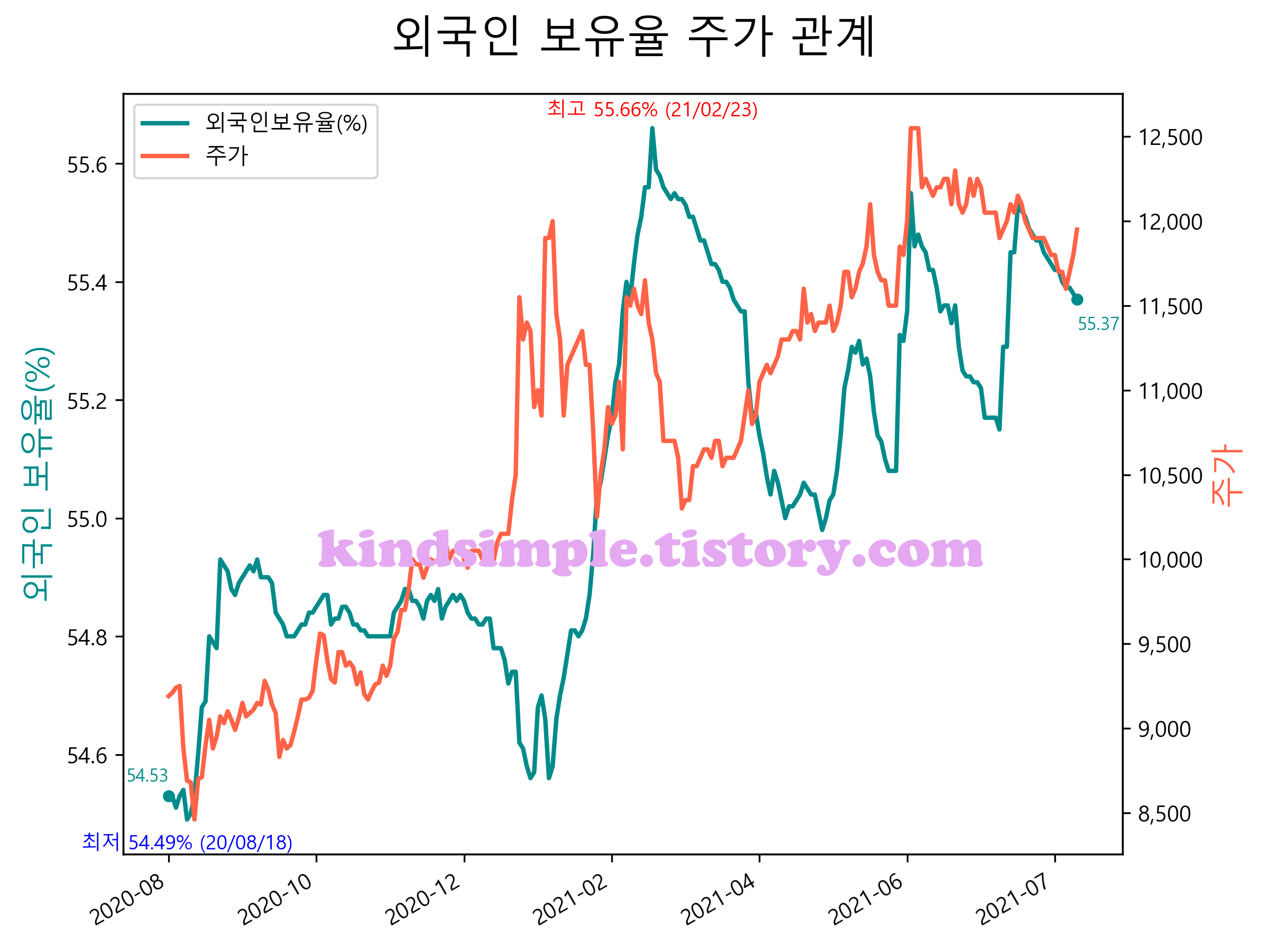최근 1년간 외국인 보유율 및 주가와의 관계입니다.