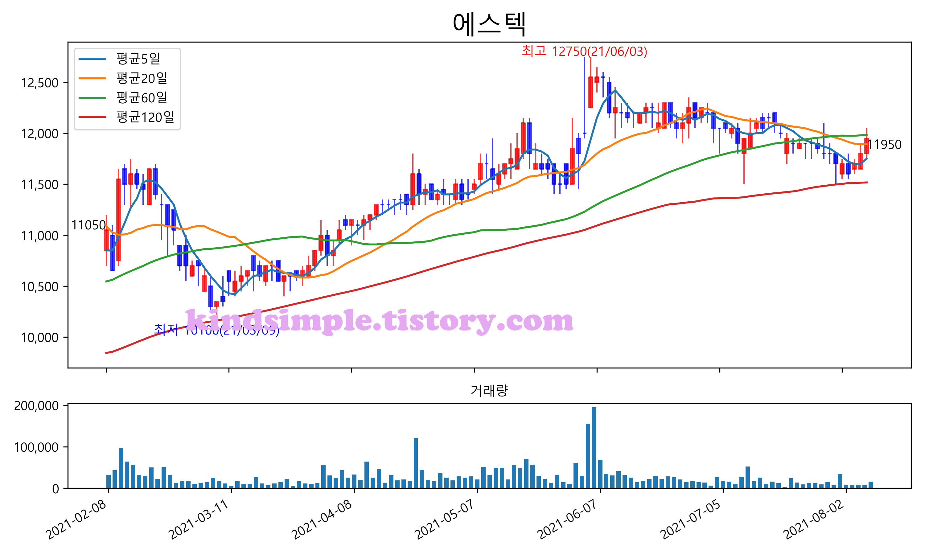 최근 6개월간 캔들차트 및 이동평균선입니다.