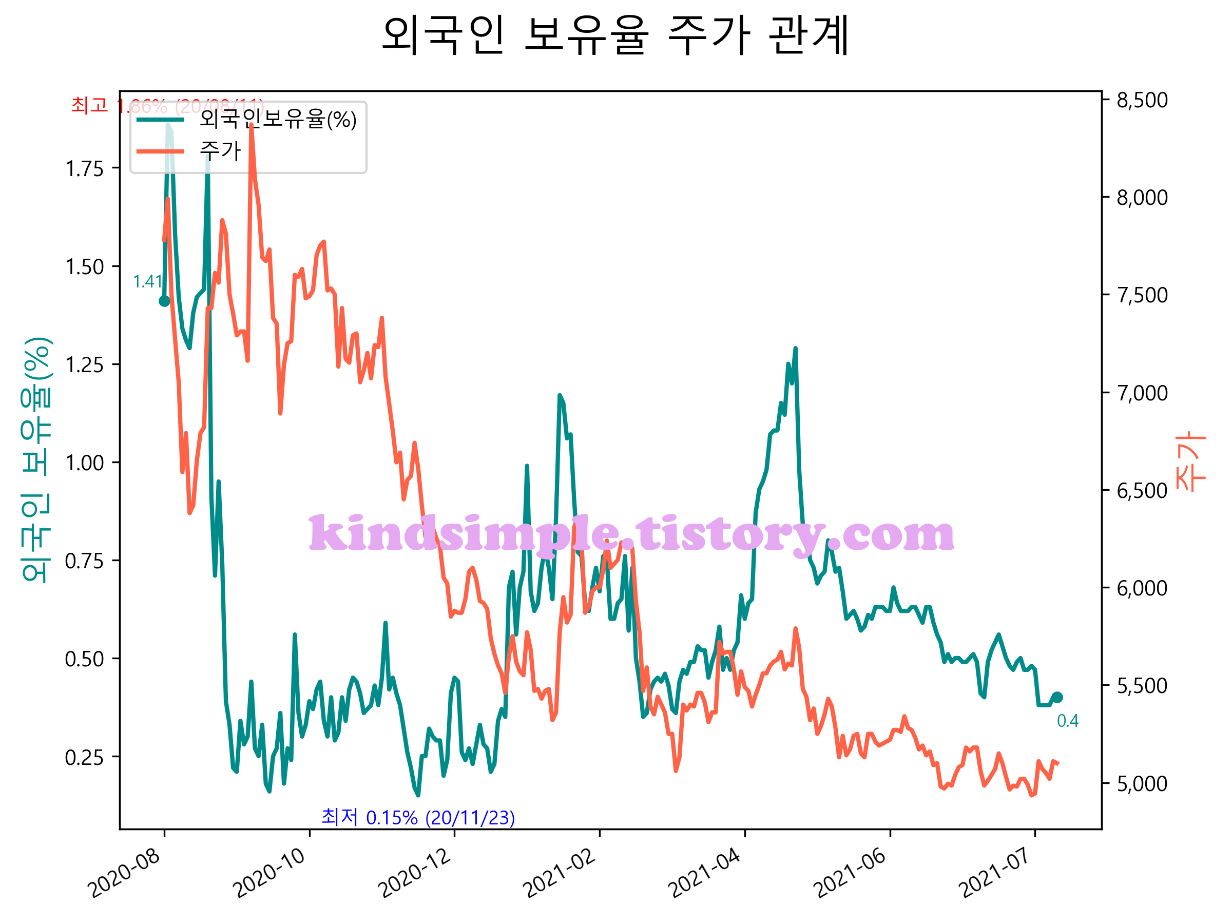 최근 1년간 외국인 보유율 및 주가와의 관계입니다.