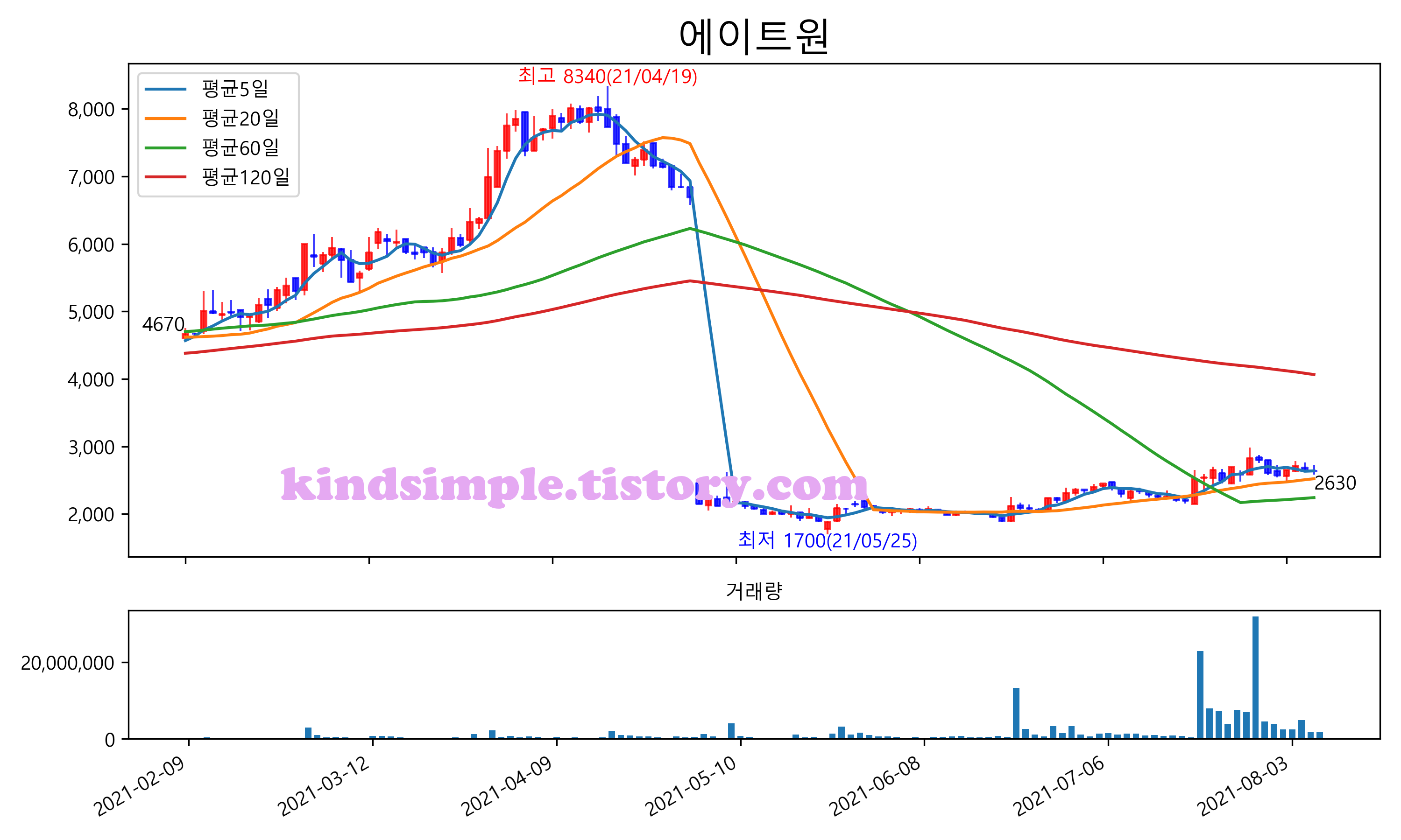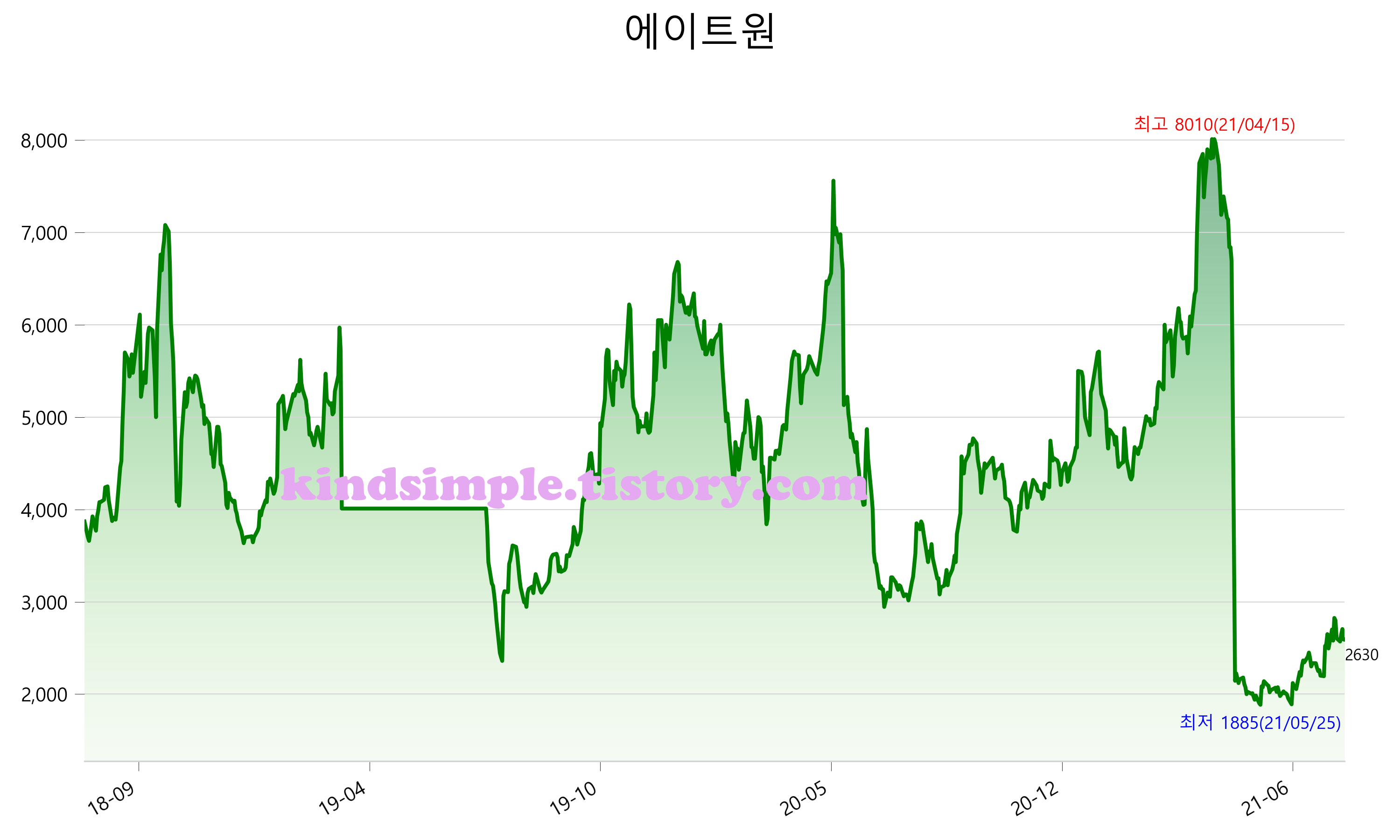 52주 최고가는 8,010원(2021-04-13), 52주 최저가는 1,885원(2021-05-25)으로 52주간 변동률은 -23.3% 입니다.