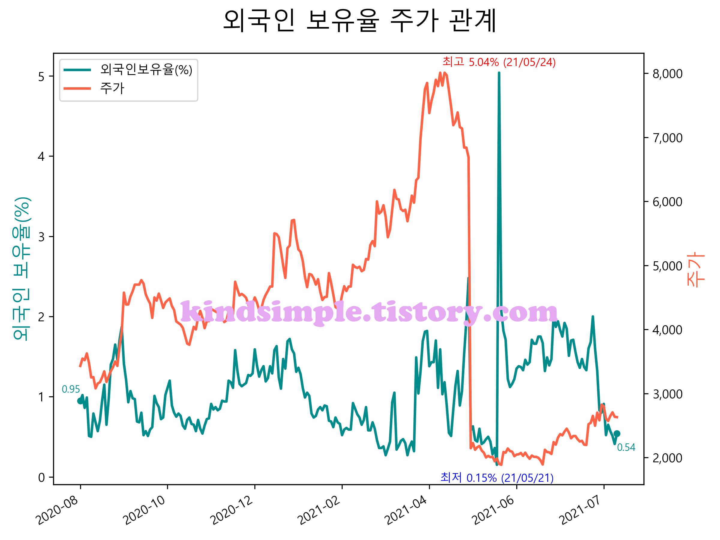 최근 1년간 외국인 보유율 및 주가와의 관계입니다.