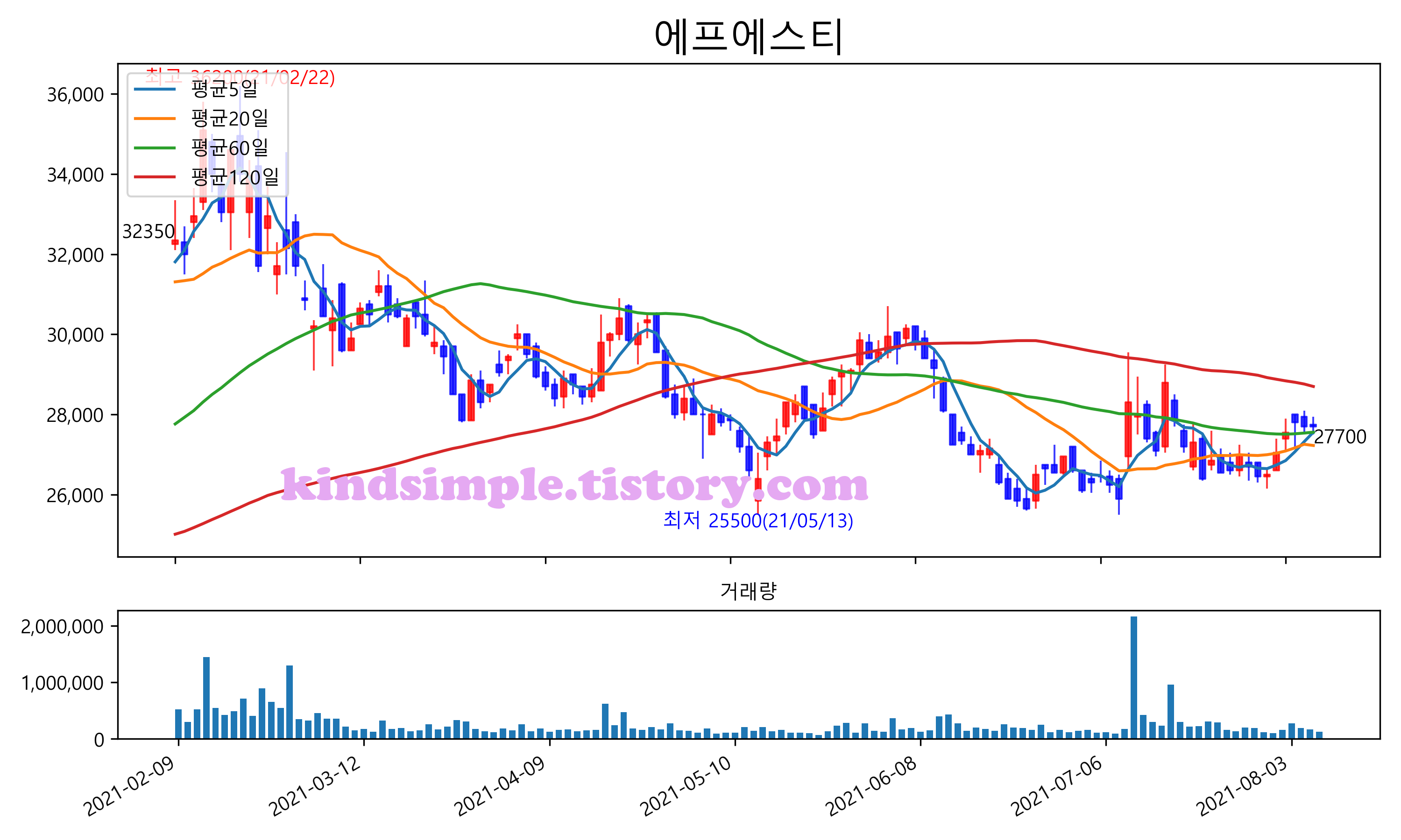 최근 6개월간 캔들차트 및 이동평균선입니다.