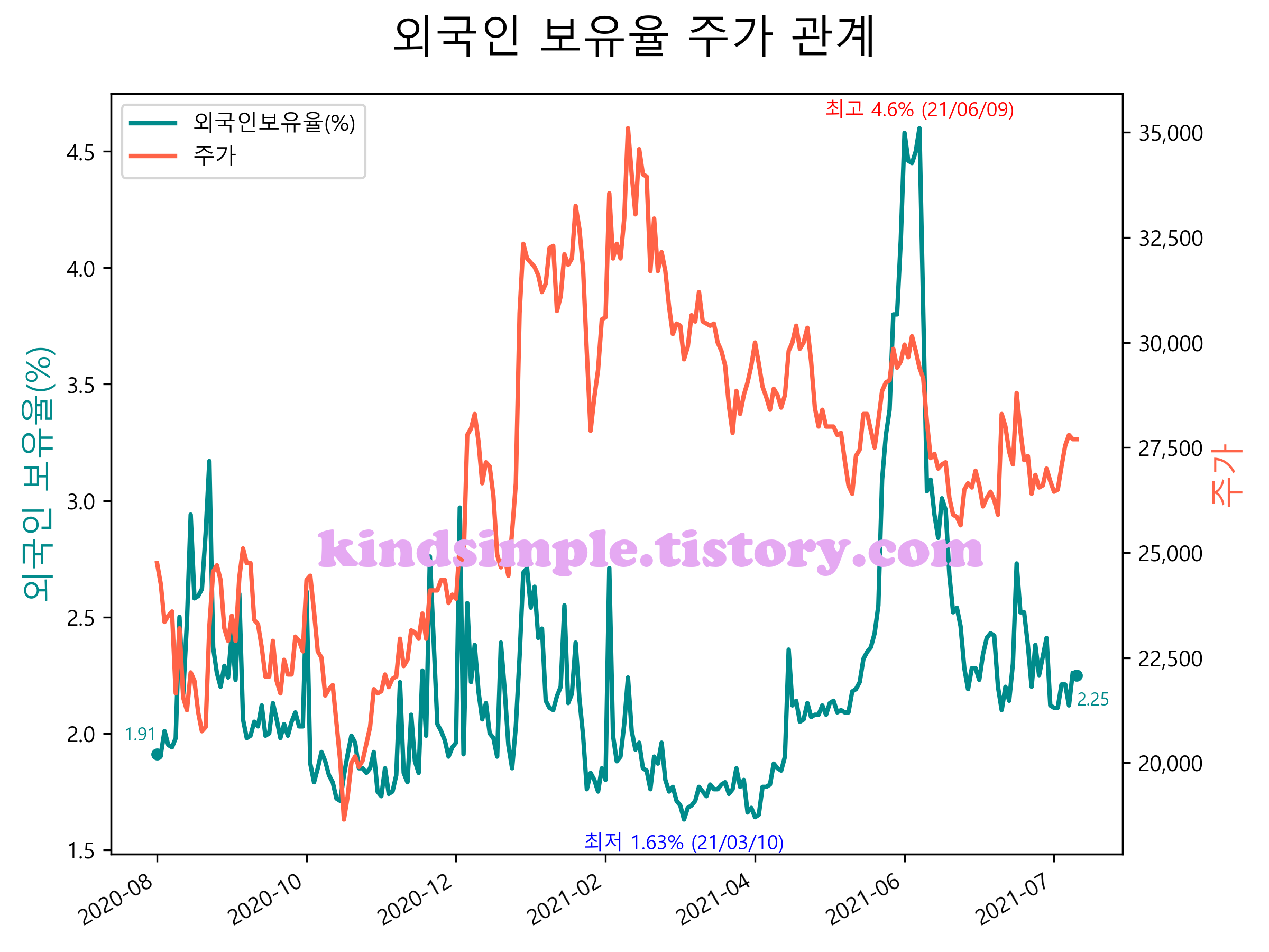 최근 1년간 외국인 보유율 및 주가와의 관계입니다.
