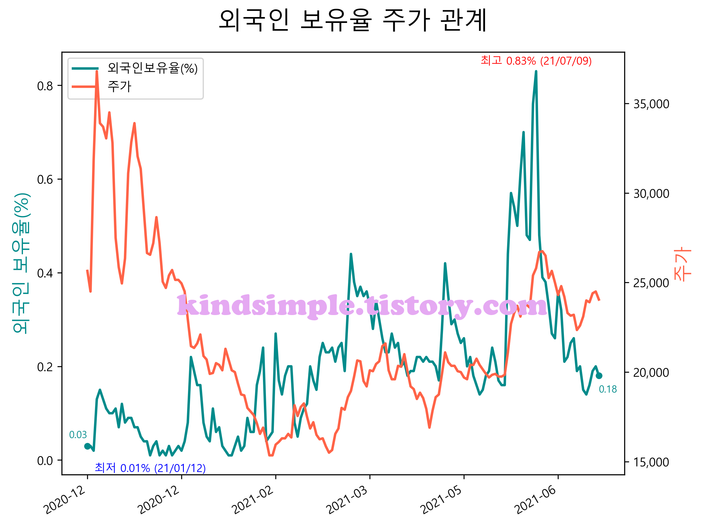 최근 1년간 외국인 보유율 및 주가와의 관계입니다.