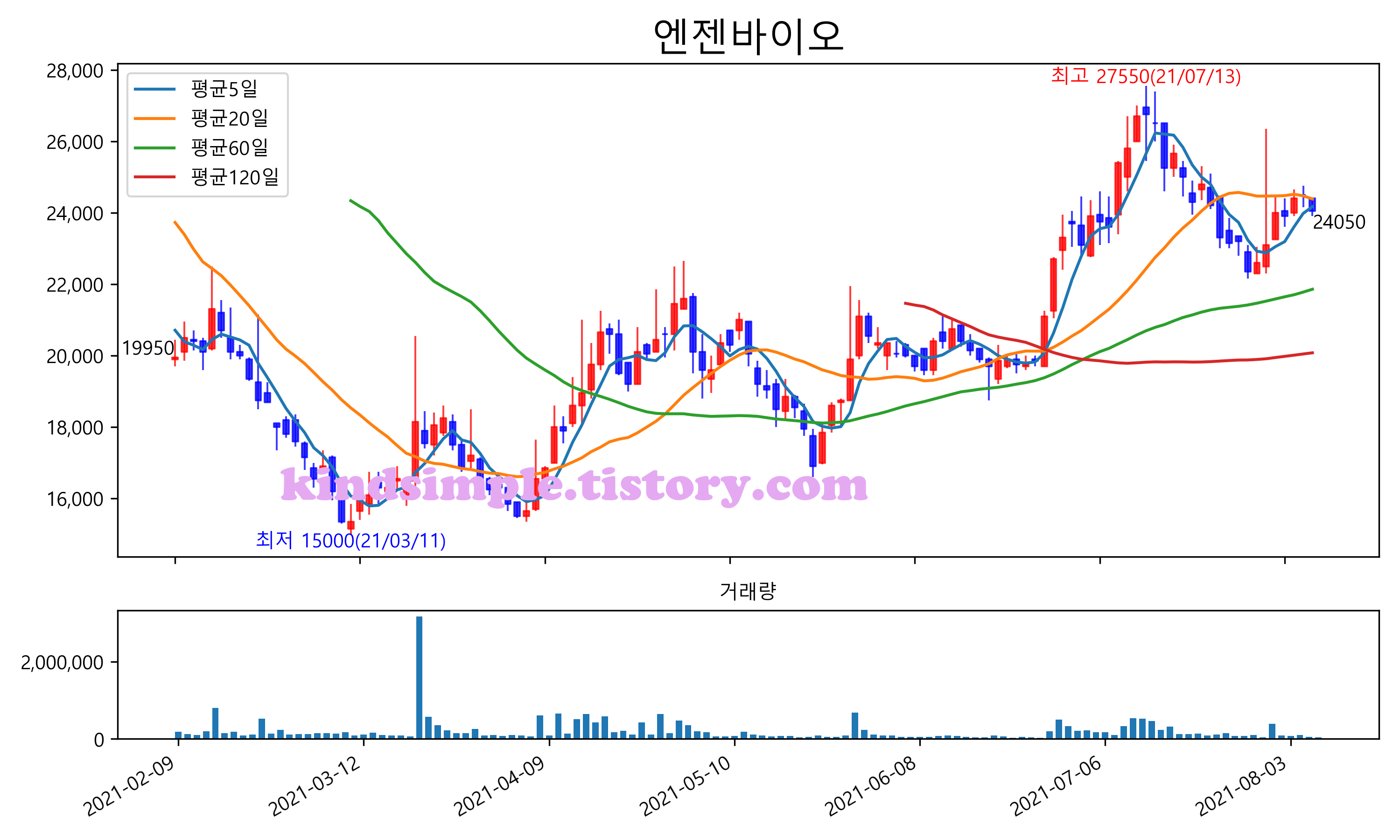 최근 6개월간 캔들차트 및 이동평균선입니다.