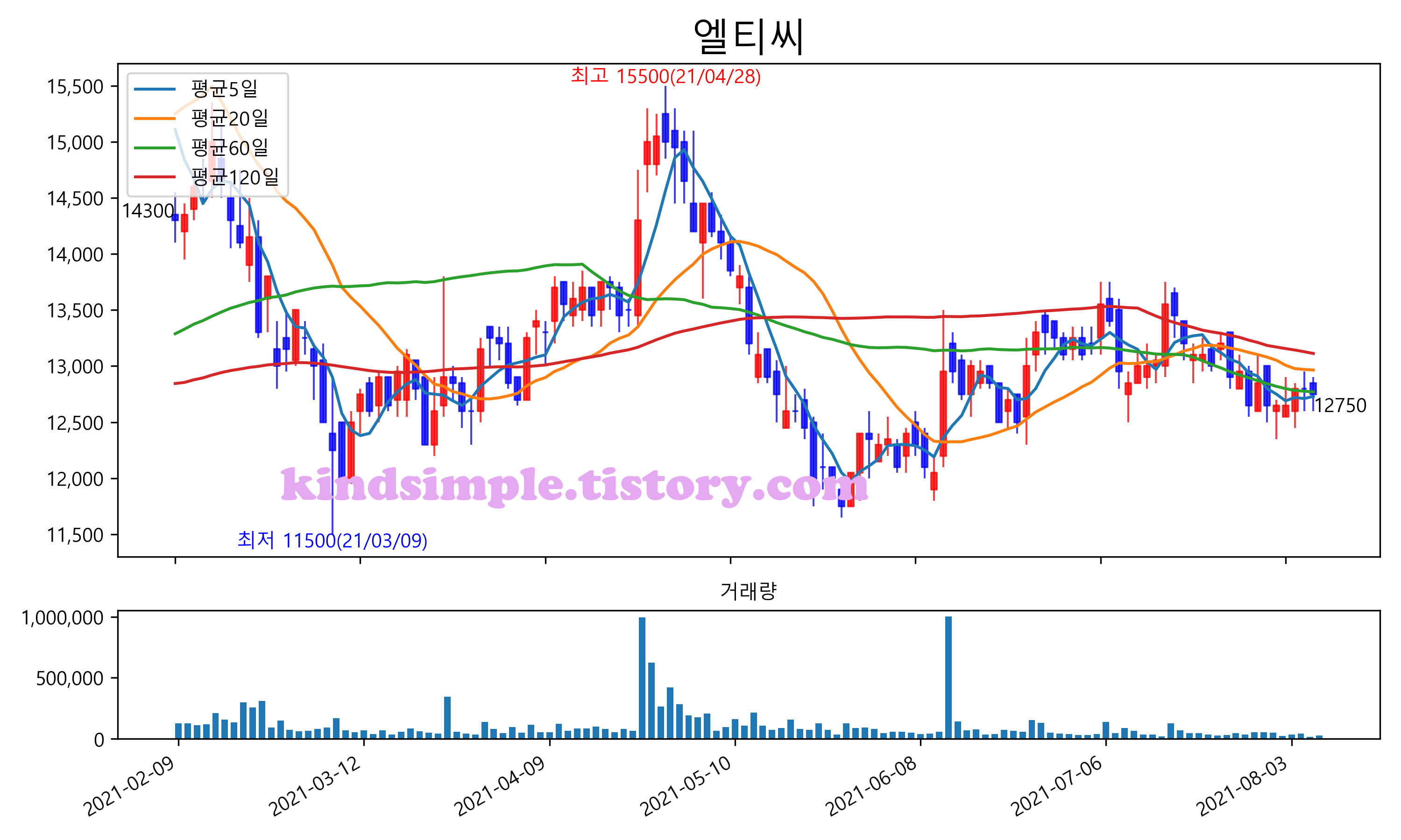 최근 6개월간 캔들차트 및 이동평균선입니다.