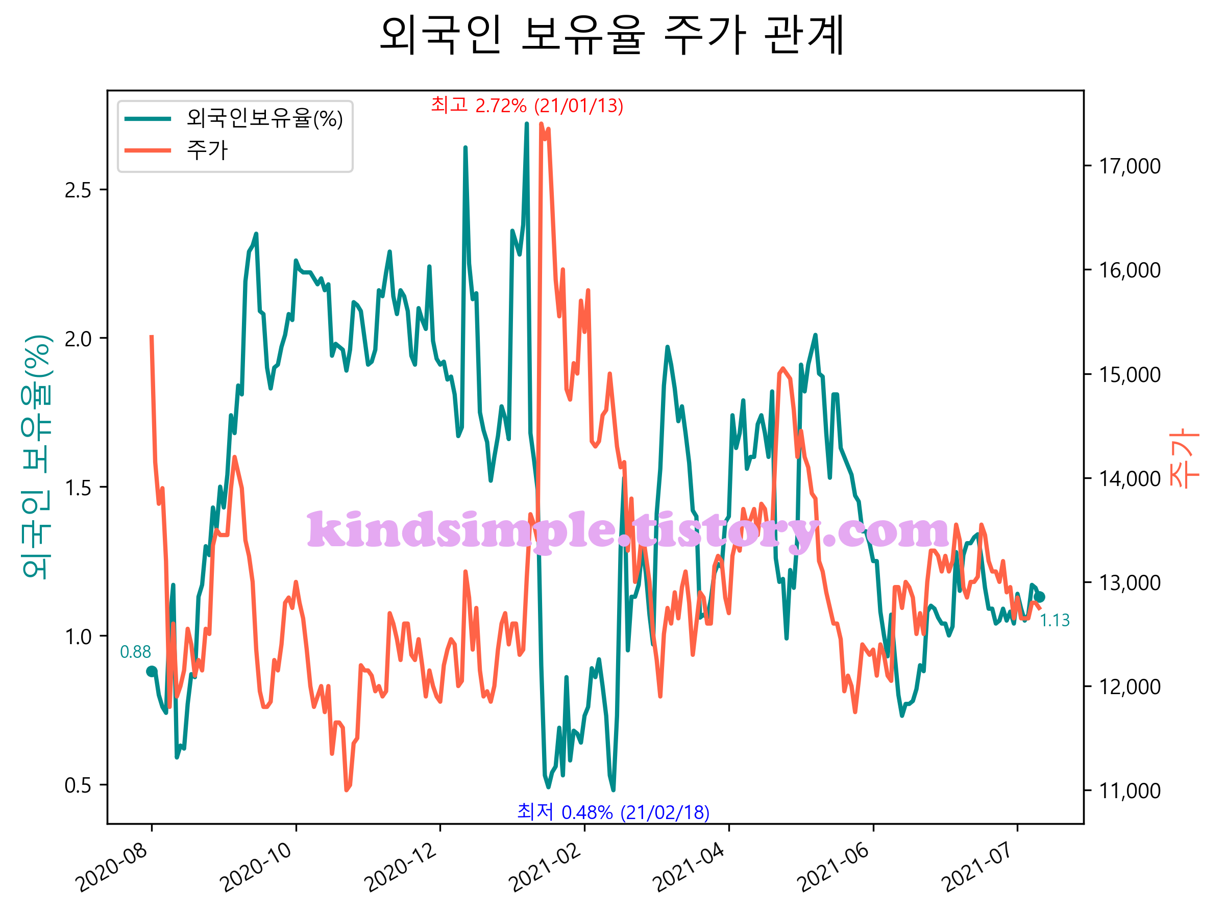 최근 1년간 외국인 보유율 및 주가와의 관계입니다.